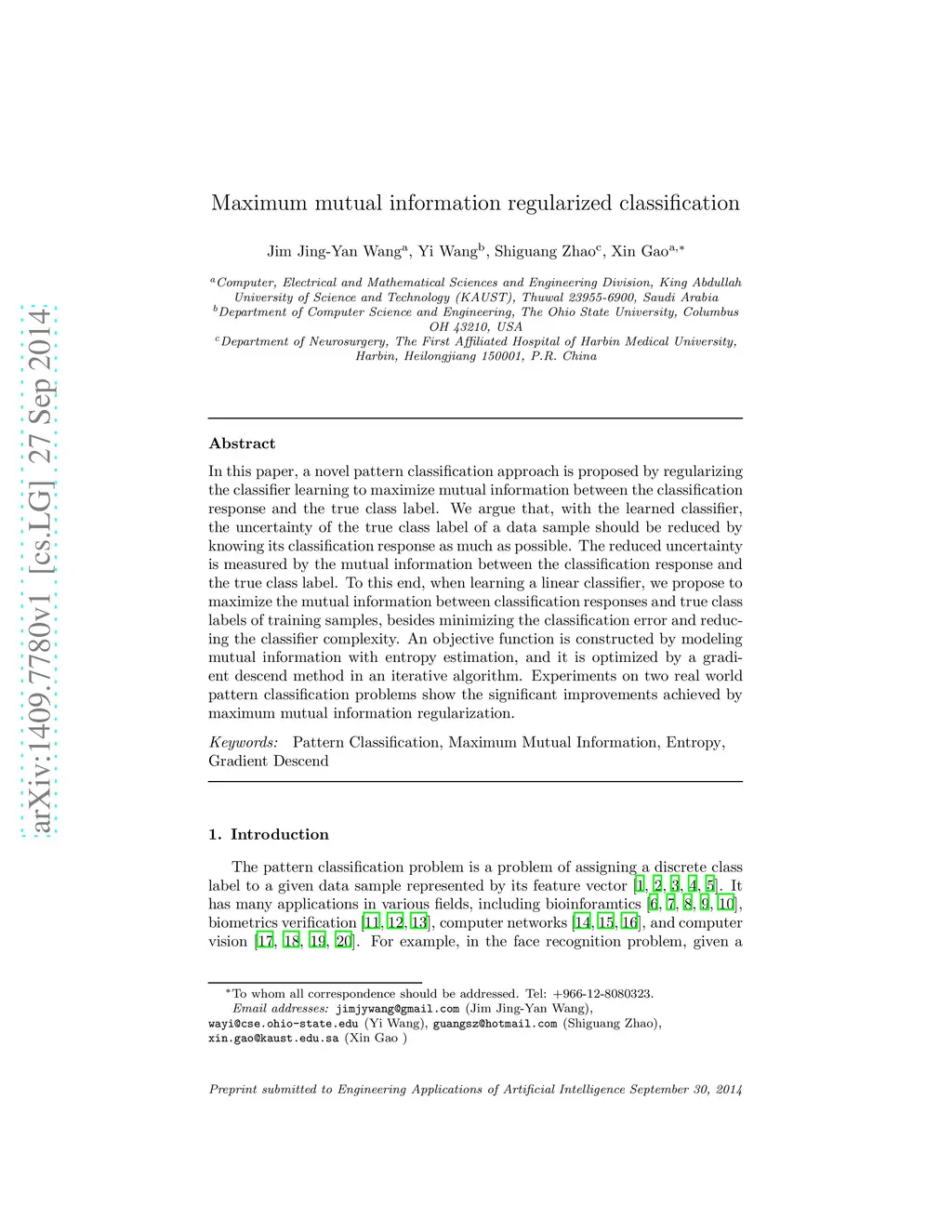 Maximum mutual information regularized classification