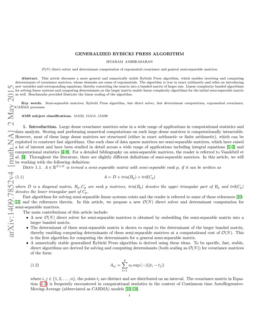 This article discusses a more general and numerically stable Rybicki Press algorithm, which enables inverting and computing determinants of covariance matrices, whose elements are sums of exponentials. The algorithm is true in exact arithmetic and relies on introducing new variables and corresponding equations, thereby converting the matrix into a banded matrix of larger size. Linear complexity banded algorithms for solving linear systems and computing determinants on the larger matrix enable linear complexity algorithms for the initial semi-separable matrix as well. Benchmarks provided illustrate the linear scaling of the algorithm.