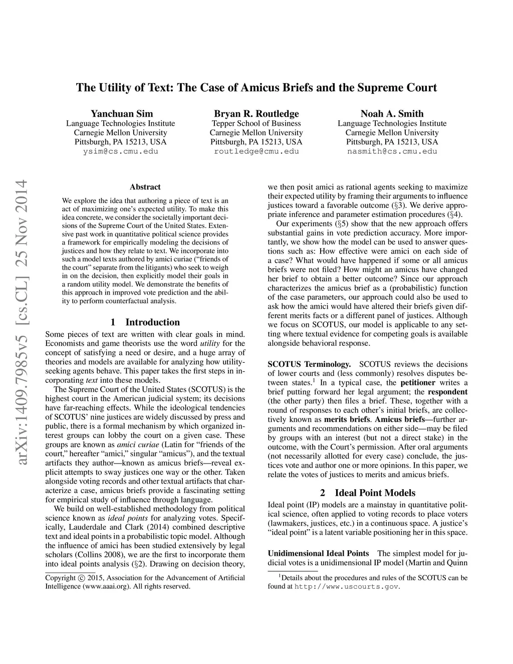 We explore the idea that authoring a piece of text is an act of maximizing one's expected utility. To make this idea concrete, we consider the societally important decisions of the Supreme Court of the United States. Extensive past work in quantitative political science provides a framework for empirically modeling the decisions of justices and how they relate to text. We incorporate into such a model texts authored by amici curiae ("friends of the court" separate from the litigants) who seek to weigh in on the decision, then explicitly model their goals in a random utility model. We demonstrate the benefits of this approach in improved vote prediction and the ability to perform counterfactual analysis.