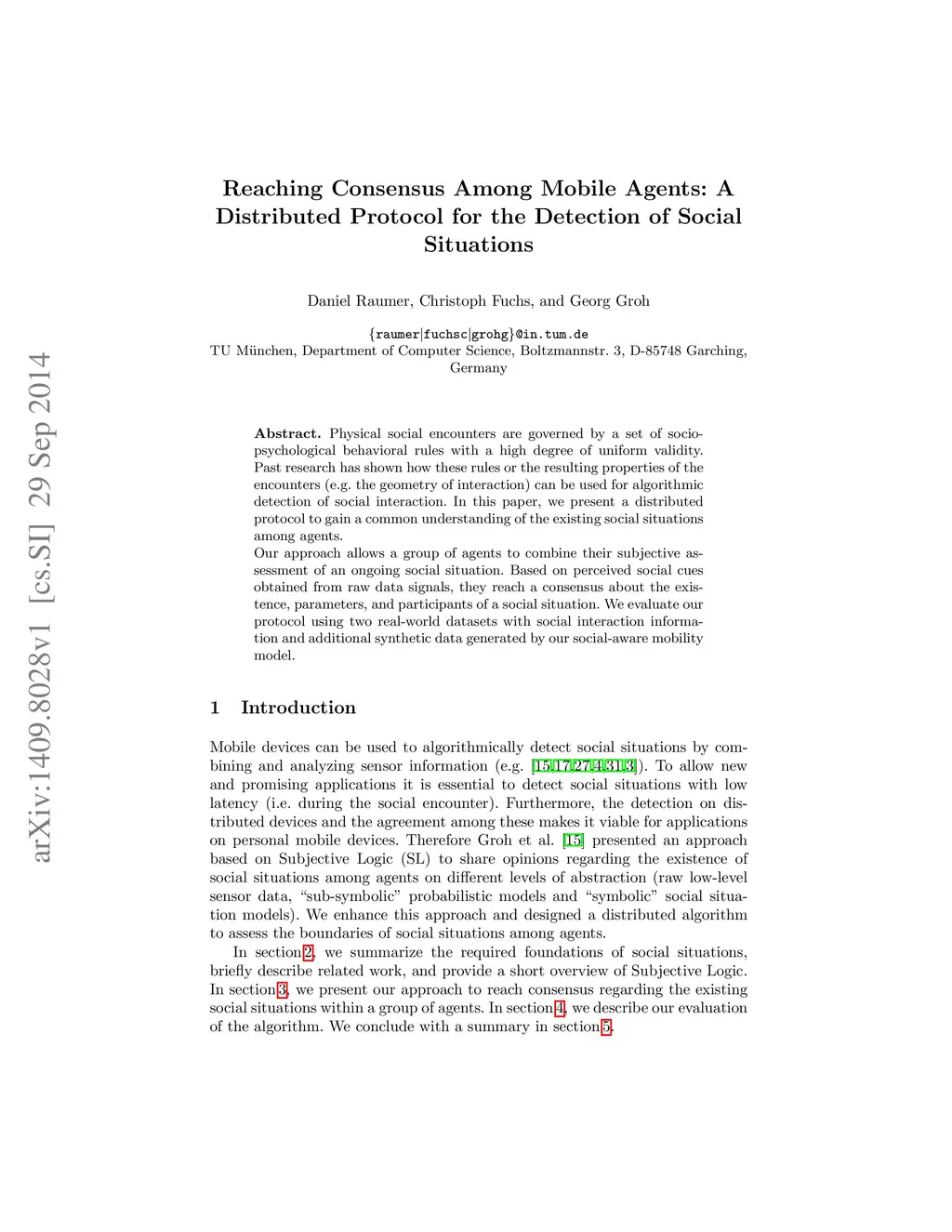 Physical social encounters are governed by a set of socio-psychological behavioral rules with a high degree of uniform validity. Past research has shown how these rules or the resulting properties of the encounters (e.g. the geometry of interaction) can be used for algorithmic detection of social interaction. In this paper, we present a distributed protocol to gain a common understanding of the existing social situations among agents. Our approach allows a group of agents to combine their subjective assessment of an ongoing social situation. Based on perceived social cues obtained from raw data signals, they reach a consensus about the existence, parameters, and participants of a social situation. We evaluate our protocol using two real-world datasets with social interaction information and additional synthetic data generated by our social-aware mobility model.