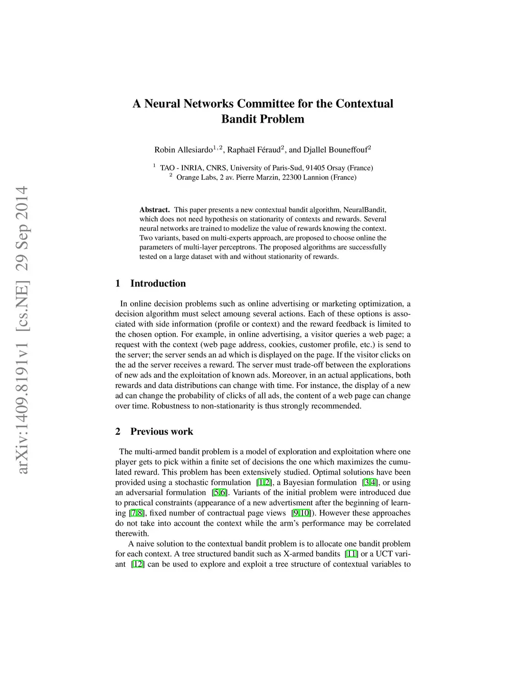 This paper presents a new contextual bandit algorithm, NeuralBandit, which does not need hypothesis on stationarity of contexts and rewards. Several neural networks are trained to modelize the value of rewards knowing the context. Two variants, based on multi-experts approach, are proposed to choose online the parameters of multi-layer perceptrons. The proposed algorithms are successfully tested on a large dataset with and without stationarity of rewards.