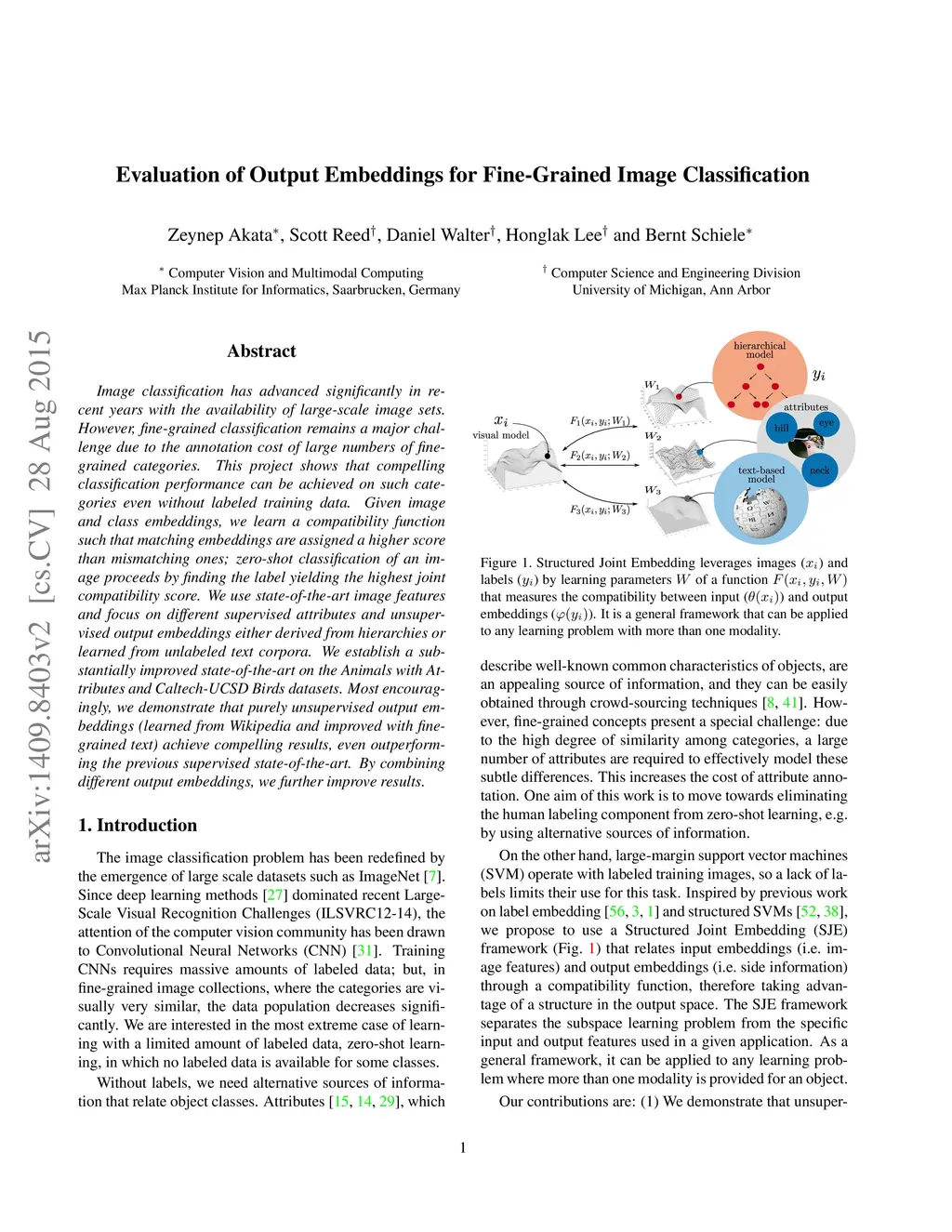 Image classification has advanced significantly in recent years with the availability of large-scale image sets. However, fine-grained classification remains a major challenge due to the annotation cost of large numbers of fine-grained categories. This project shows that compelling classification performance can be achieved on such categories even without labeled training data. Given image and class embeddings, we learn a compatibility function such that matching embeddings are assigned a higher score than mismatching ones; zero-shot classification of an image proceeds by finding the label yielding the highest joint compatibility score. We use state-of-the-art image features and focus on different supervised attributes and unsupervised output embeddings either derived from hierarchies or learned from unlabeled text corpora. We establish a substantially improved state-of-the-art on the Animals with Attributes and Caltech-UCSD Birds datasets. Most encouragingly, we demonstrate that purely unsupervised output embeddings (learned from Wikipedia and improved with fine-grained text) achieve compelling results, even outperforming the previous supervised state-of-the-art. By combining different output embeddings, we further improve results.