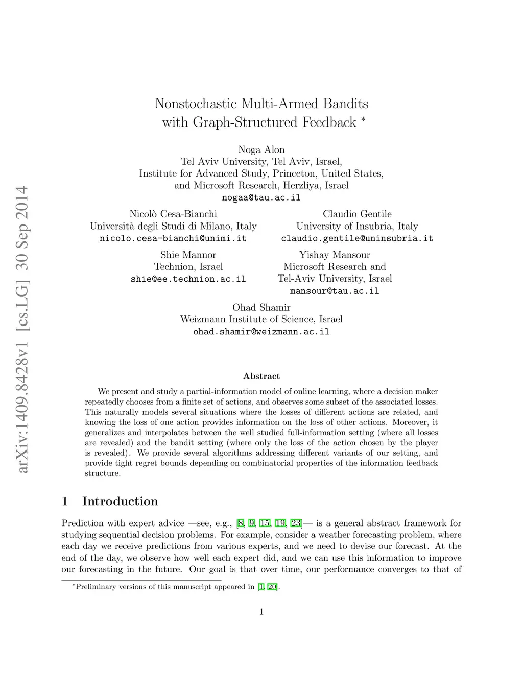 We present and study a partial-information model of online learning, where a decision maker repeatedly chooses from a finite set of actions, and observes some subset of the associated losses. This naturally models several situations where the losses of different actions are related, and knowing the loss of one action provides information on the loss of other actions. Moreover, it generalizes and interpolates between the well studied full-information setting (where all losses are revealed) and the bandit setting (where only the loss of the action chosen by the player is revealed). We provide several algorithms addressing different variants of our setting, and provide tight regret bounds depending on combinatorial properties of the information feedback structure.