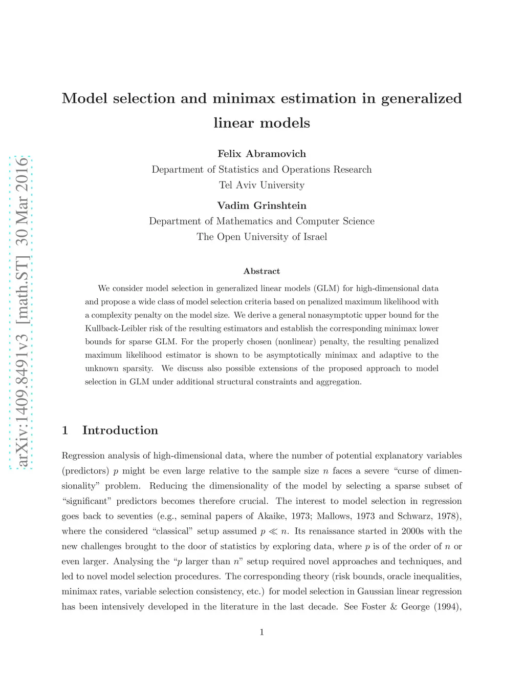 We consider model selection in generalized linear models (GLM) for high-dimensional data and propose a wide class of model selection criteria based on penalized maximum likelihood with a complexity penalty on the model size. We derive a general nonasymptotic upper bound for the expected Kullback-Leibler divergence between the true distribution of the data and that generated by a selected model, and establish the corresponding minimax lower bounds for sparse GLM. For the properly chosen (nonlinear) penalty, the resulting penalized maximum likelihood estimator is shown to be asymptotically minimax and adaptive to the unknown sparsity. We discuss also possible extensions of the proposed approach to model selection in GLM under additional structural constraints and aggregation.