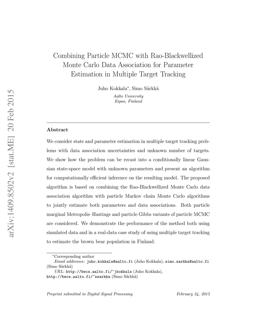 We consider state and parameter estimation in multiple target tracking problems with data association uncertainties and unknown number of targets. We show how the problem can be recast into a conditionally linear Gaussian state-space model with unknown parameters and present an algorithm for computationally efficient inference on the resulting model. The proposed algorithm is based on combining the Rao-Blackwellized Monte Carlo data association algorithm with particle Markov chain Monte Carlo algorithms to jointly estimate both parameters and data associations. Both particle marginal Metropolis-Hastings and particle Gibbs variants of particle MCMC are considered. We demonstrate the performance of the method both using simulated data and in a real-data case study of using multiple target tracking to estimate the brown bear population in Finland.