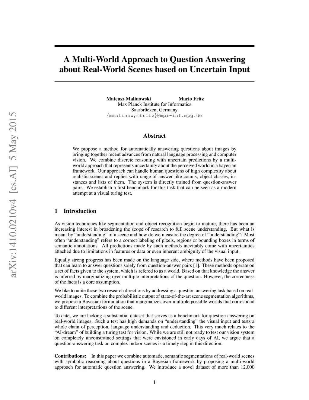 We propose a method for automatically answering questions about images by bringing together recent advances from natural language processing and computer vision. We combine discrete reasoning with uncertain predictions by a multi-world approach that represents uncertainty about the perceived world in a bayesian framework. Our approach can handle human questions of high complexity about realistic scenes and replies with range of answer like counts, object classes, instances and lists of them. The system is directly trained from question-answer pairs. We establish a first benchmark for this task that can be seen as a modern attempt at a visual turing test.