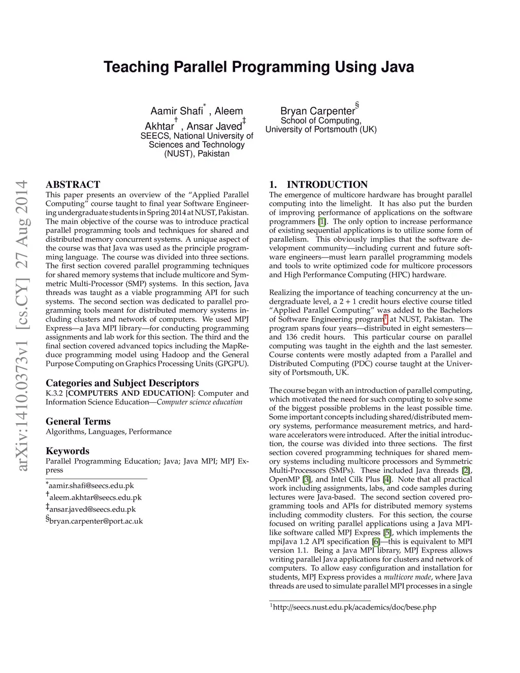 This paper presents an overview of the "Applied Parallel Computing" course taught to final year Software Engineering undergraduate students in Spring 2014 at NUST, Pakistan. The main objective of the course was to introduce practical parallel programming tools and techniques for shared and distributed memory concurrent systems. A unique aspect of the course was that Java was used as the principle programming language. The course was divided into three sections. The first section covered parallel programming techniques for shared memory systems that include multicore and Symmetric Multi-Processor (SMP) systems. In this section, Java threads was taught as a viable programming API for such systems. The second section was dedicated to parallel programming tools meant for distributed memory systems including clusters and network of computers. We used MPJ Express-a Java MPI library-for conducting programming assignments and lab work for this section. The third and the final section covered advanced topics including the MapReduce programming model using Hadoop and the General Purpose Computing on Graphics Processing Units (GPGPU).