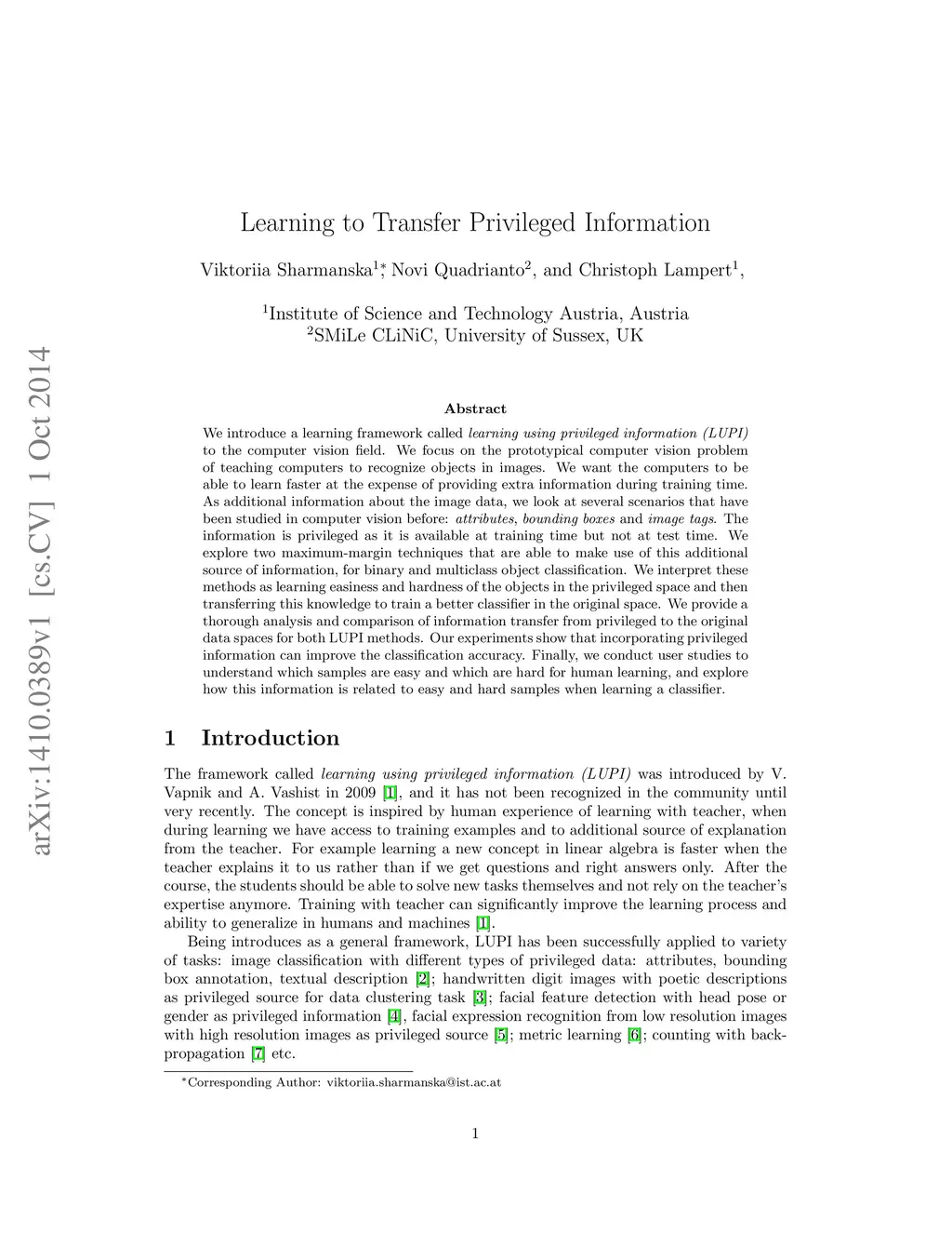 We introduce a learning framework called learning using privileged information (LUPI) to the computer vision field. We focus on the prototypical computer vision problem of teaching computers to recognize objects in images. We want the computers to be able to learn faster at the expense of providing extra information during training time. As additional information about the image data, we look at several scenarios that have been studied in computer vision before: attributes, bounding boxes and image tags. The information is privileged as it is available at training time but not at test time. We explore two maximum-margin techniques that are able to make use of this additional source of information, for binary and multiclass object classification. We interpret these methods as learning easiness and hardness of the objects in the privileged space and then transferring this knowledge to train a better classifier in the original space. We provide a thorough analysis and comparison of information transfer from privileged to the original data spaces for both LUPI methods. Our experiments show that incorporating privileged information can improve the classification accuracy. Finally, we conduct user studies to understand which samples are easy and which are hard for human learning, and explore how this information is related to easy and hard samples when learning a classifier.