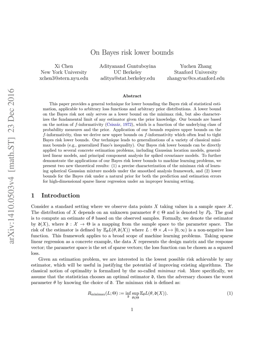 This paper provides a general technique for lower bounding the Bayes risk of statistical estimation, applicable to arbitrary loss functions and arbitrary prior distributions. A lower bound on the Bayes risk not only serves as a lower bound on the minimax risk, but also characterizes the fundamental limit of any estimator given the prior knowledge. Our bounds are based on the notion of -informativity, which is a function of the underlying class of probability measures and the prior. Application of our bounds requires upper bounds on the -informativity, thus we derive new upper bounds on -informativity which often lead to tight Bayes risk lower bounds. Our technique leads to generalizations of a variety of classical minimax bounds (e.g., generalized Fano's inequality). Our Bayes risk lower bounds can be directly applied to several concrete estimation problems, including Gaussian location models, generalized linear models, and principal component analysis for spiked covariance models. To further demonstrate the applications of our Bayes risk lower bounds to machine learning problems, we present two new theoretical results: (1) a precise characterization of the minimax risk of learning spherical Gaussian mixture models under the smoothed analysis framework, and (2) lower bounds for the Bayes risk under a natural prior for both the prediction and estimation errors for high-dimensional sparse linear regression under an improper learning setting.