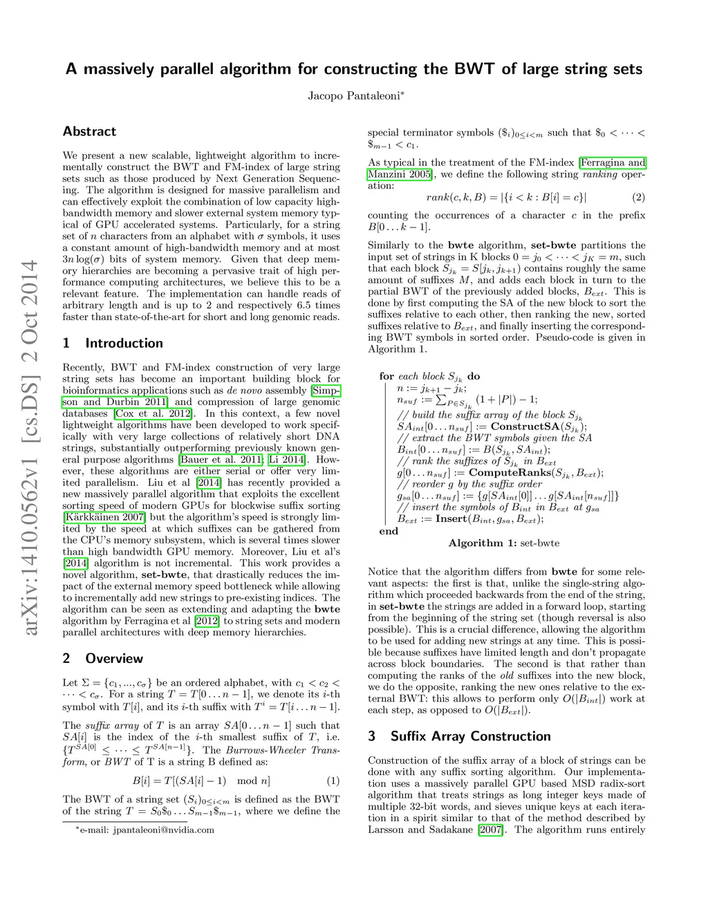 We present a new scalable, lightweight algorithm to incrementally construct the BWT and FM-index of large string sets such as those produced by Next Generation Sequencing. The algorithm is designed for massive parallelism and can effectively exploit the combination of low capacity high bandwidth memory and slower external system memory typical of GPU accelerated systems. Particularly, for a string set of n characters from an alphabet with \sigma symbols, it uses a constant amount of high-bandwidth memory and at most 3n log(\sigma) bits of system memory. Given that deep memory hierarchies are becoming a pervasive trait of high performance computing architectures, we believe this to be a relevant feature. The implementation can handle reads of arbitrary length and is up to 2 and respectively 6.5 times faster than state-of-the-art for short and long genomic reads