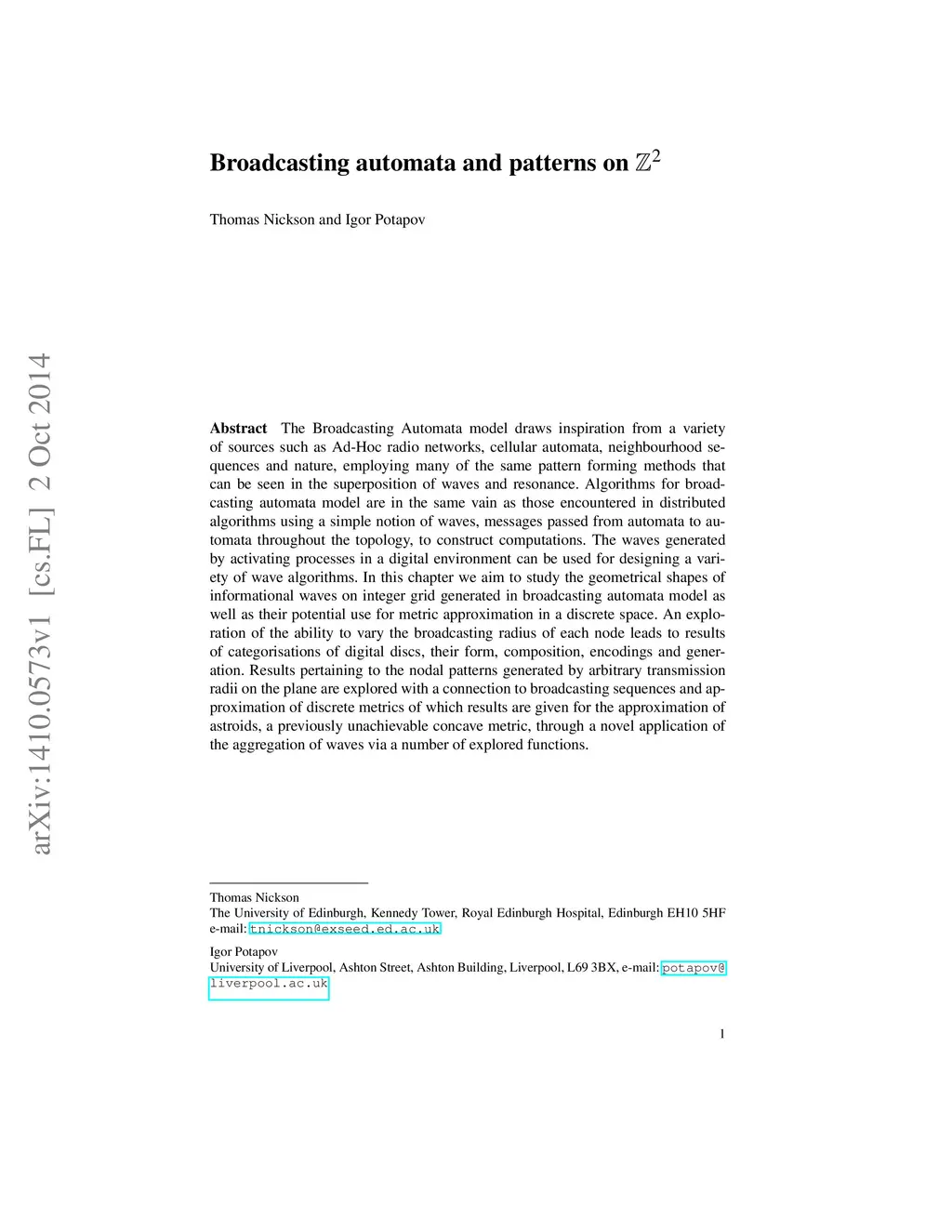 The Broadcasting Automata model draws inspiration from a variety of sources such as Ad-Hoc radio networks, cellular automata, neighbourhood se- quences and nature, employing many of the same pattern forming methods that can be seen in the superposition of waves and resonance. Algorithms for broad- casting automata model are in the same vain as those encountered in distributed algorithms using a simple notion of waves, messages passed from automata to au- tomata throughout the topology, to construct computations. The waves generated by activating processes in a digital environment can be used for designing a vari- ety of wave algorithms. In this chapter we aim to study the geometrical shapes of informational waves on integer grid generated in broadcasting automata model as well as their potential use for metric approximation in a discrete space. An explo- ration of the ability to vary the broadcasting radius of each node leads to results of categorisations of digital discs, their form, composition, encodings and gener- ation. Results pertaining to the nodal patterns generated by arbitrary transmission radii on the plane are explored with a connection to broadcasting sequences and ap- proximation of discrete metrics of which results are given for the approximation of astroids, a previously unachievable concave metric, through a novel application of the aggregation of waves via a number of explored functions.