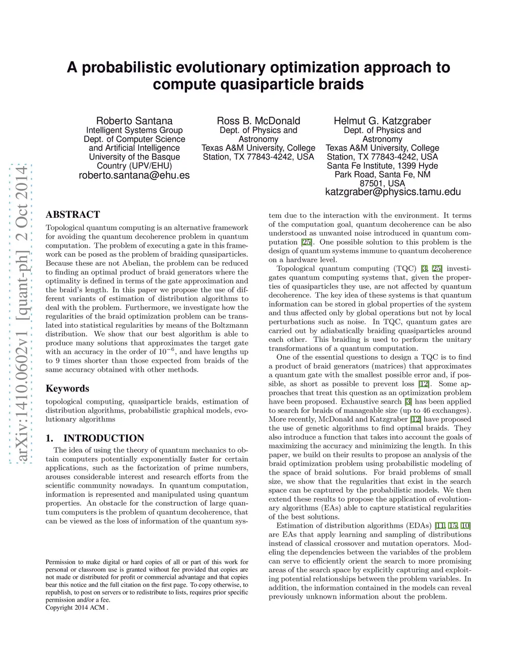 Topological quantum computing is an alternative framework for avoiding the quantum decoherence problem in quantum computation. The problem of executing a gate in this framework can be posed as the problem of braiding quasiparticles. Because these are not Abelian, the problem can be reduced to finding an optimal product of braid generators where the optimality is defined in terms of the gate approximation and the braid's length. In this paper we propose the use of different variants of estimation of distribution algorithms to deal with the problem. Furthermore, we investigate how the regularities of the braid optimization problem can be translated into statistical regularities by means of the Boltzmann distribution. We show that our best algorithm is able to produce many solutions that approximates the target gate with an accuracy in the order of , and have lengths up to 9 times shorter than those expected from braids of the same accuracy obtained with other methods.