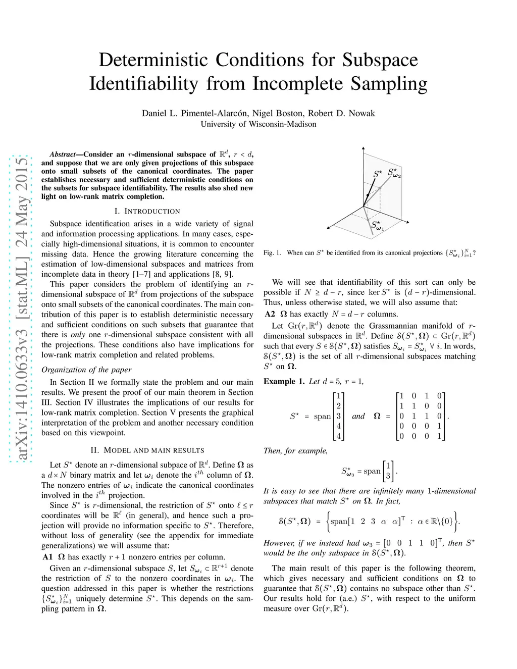 Consider a generic -dimensional subspace of , , and suppose that we are only given projections of this subspace onto small subsets of the canonical coordinates. The paper establishes necessary and sufficient deterministic conditions on the subsets for subspace identifiability.