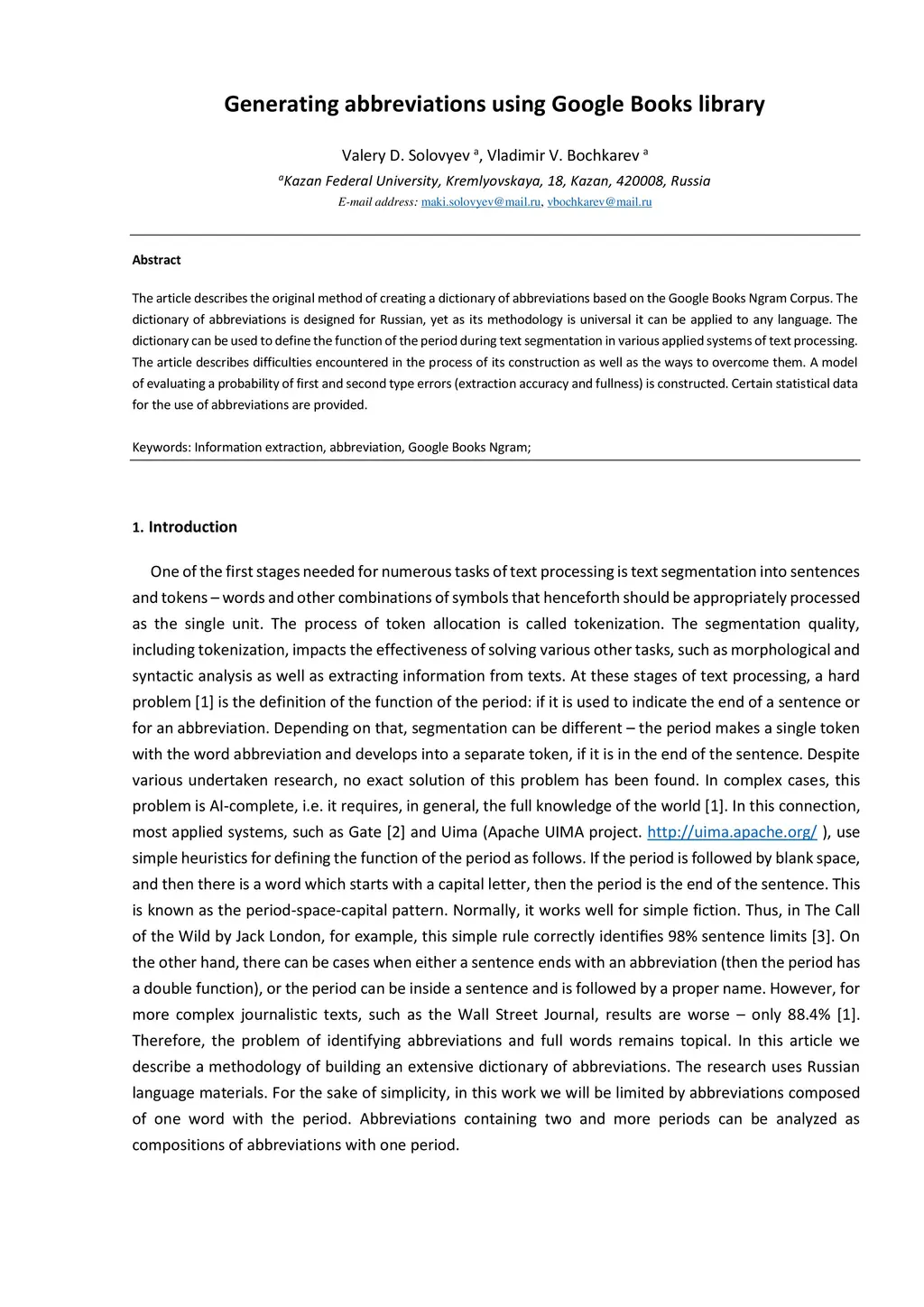 The article describes the original method of creating a dictionary of abbreviations based on the Google Books Ngram Corpus. The dictionary of abbreviations is designed for Russian, yet as its methodology is universal it can be applied to any language. The dictionary can be used to define the function of the period during text segmentation in various applied systems of text processing. The article describes difficulties encountered in the process of its construction as well as the ways to overcome them. A model of evaluating a probability of first and second type errors (extraction accuracy and fullness) is constructed. Certain statistical data for the use of abbreviations are provided.
