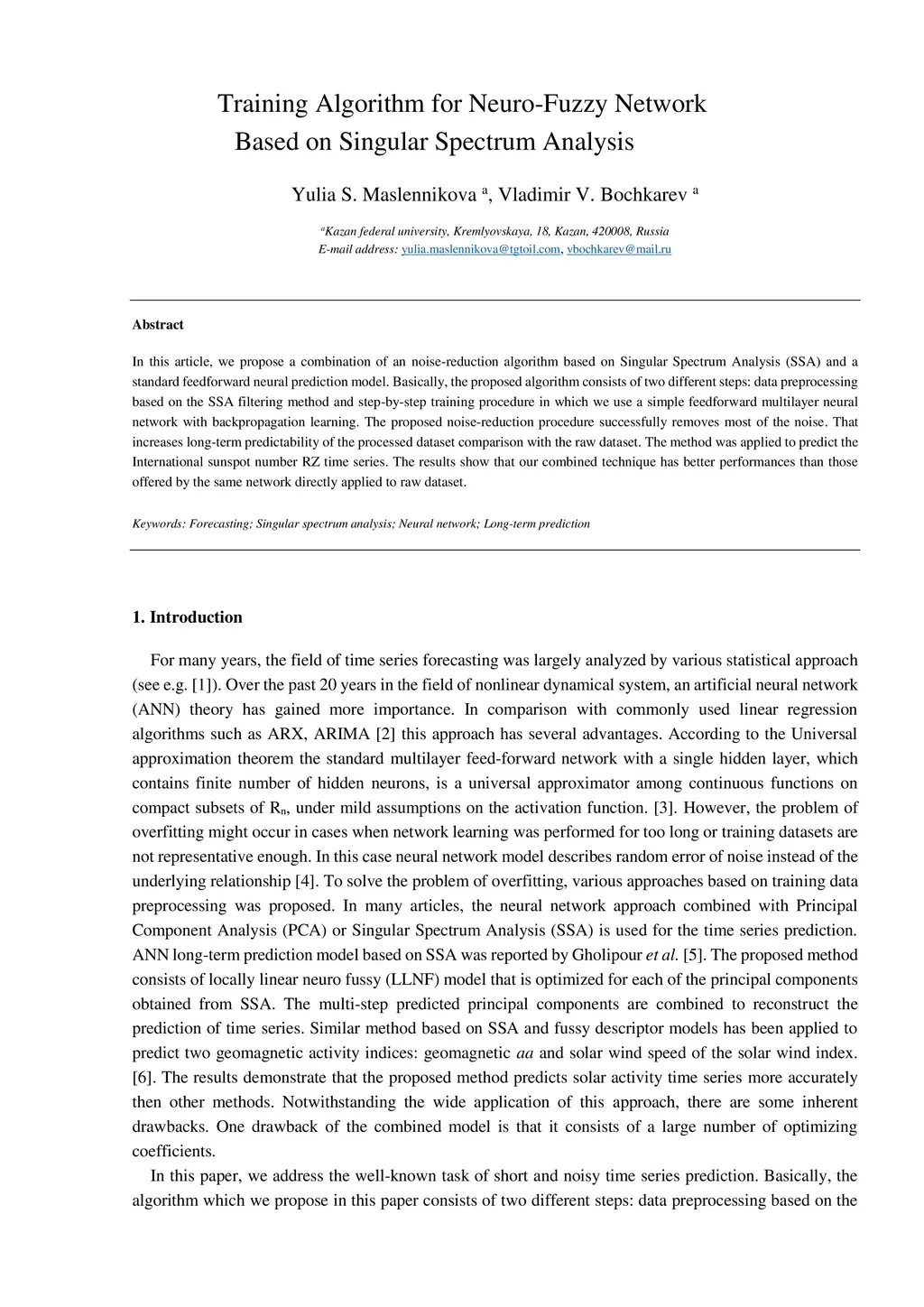 In this article, we propose a combination of an noise-reduction algorithm based on Singular Spectrum Analysis (SSA) and a standard feedforward neural prediction model. Basically, the proposed algorithm consists of two different steps: data preprocessing based on the SSA filtering method and step-by-step training procedure in which we use a simple feedforward multilayer neural network with backpropagation learning. The proposed noise-reduction procedure successfully removes most of the noise. That increases long-term predictability of the processed dataset comparison with the raw dataset. The method was applied to predict the International sunspot number RZ time series. The results show that our combined technique has better performances than those offered by the same network directly applied to raw dataset.