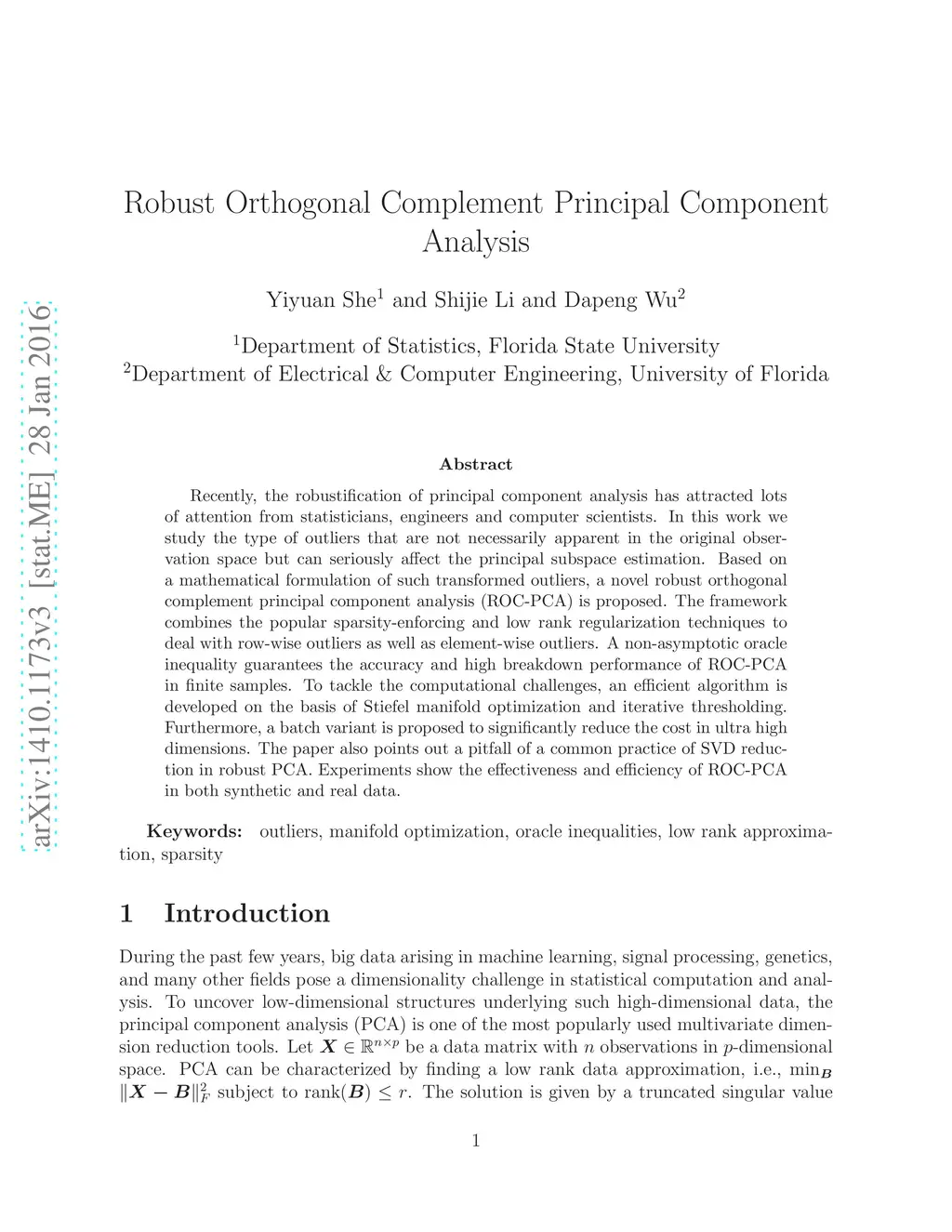 Recently, the robustification of principal component analysis has attracted lots of attention from statisticians, engineers and computer scientists. In this work we study the type of outliers that are not necessarily apparent in the original observation space but can seriously affect the principal subspace estimation. Based on a mathematical formulation of such transformed outliers, a novel robust orthogonal complement principal component analysis (ROC-PCA) is proposed. The framework combines the popular sparsity-enforcing and low rank regularization techniques to deal with row-wise outliers as well as element-wise outliers. A non-asymptotic oracle inequality guarantees the accuracy and high breakdown performance of ROC-PCA in finite samples. To tackle the computational challenges, an efficient algorithm is developed on the basis of Stiefel manifold optimization and iterative thresholding. Furthermore, a batch variant is proposed to significantly reduce the cost in ultra high dimensions. The paper also points out a pitfall of a common practice of SVD reduction in robust PCA. Experiments show the effectiveness and efficiency of ROC-PCA in both synthetic and real data.