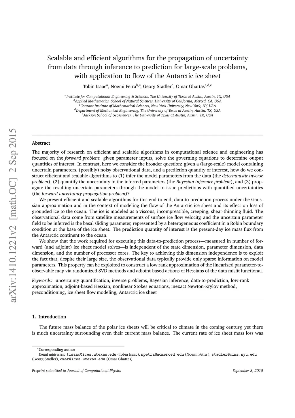 The majority of research on efficient and scalable algorithms in computational science and engineering has focused on the forward problem: given parameter inputs, solve the governing equations to determine output quantities of interest. In contrast, here we consider the broader question: given a (large-scale) model containing uncertain parameters, (possibly) noisy observational data, and a prediction quantity of interest, how do we construct efficient and scalable algorithms to (1) infer the model parameters from the data (the deterministic inverse problem), (2) quantify the uncertainty in the inferred parameters (the Bayesian inference problem), and (3) propagate the resulting uncertain parameters through the model to issue predictions with quantified uncertainties (the forward uncertainty propagation problem)? We present efficient and scalable algorithms for this end-to-end, data-to-prediction process under the Gaussian approximation and in the context of modeling the flow of the Antarctic ice sheet and its effect on sea level. The ice is modeled as a viscous, incompressible, creeping, shear-thinning fluid. The observational data come from InSAR satellite measurements of surface ice flow velocity, and the uncertain parameter field to be inferred is the basal sliding parameter. The prediction quantity of interest is the present-day ice mass flux from the Antarctic continent to the ocean. We show that the work required for executing this data-to-prediction process is independent of the state dimension, parameter dimension, data dimension, and number of processor cores. The key to achieving this dimension independence is to exploit the fact that the observational data typically provide only sparse information on model parameters. This property can be exploited to construct a low rank approximation of the linearized parameter-to-observable map.