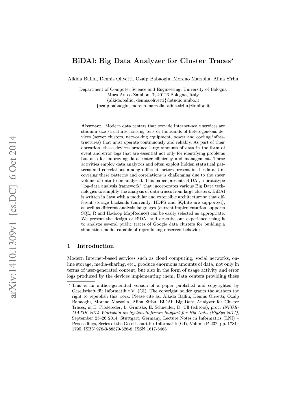 Modern data centers that provide Internet-scale services are stadium-size structures housing tens of thousands of heterogeneous devices (server clusters, networking equipment, power and cooling infrastructures) that must operate continuously and reliably. As part of their operation, these devices produce large amounts of data in the form of event and error logs that are essential not only for identifying problems but also for improving data center efficiency and management. These activities employ data analytics and often exploit hidden statistical patterns and correlations among different factors present in the data. Uncovering these patterns and correlations is challenging due to the sheer volume of data to be analyzed. This paper presents BiDAl, a prototype "log-data analysis framework" that incorporates various Big Data technologies to simplify the analysis of data traces from large clusters. BiDAl is written in Java with a modular and extensible architecture so that different storage backends (currently, HDFS and SQLite are supported), as well as different analysis languages (current implementation supports SQL, R and Hadoop MapReduce) can be easily selected as appropriate. We present the design of BiDAl and describe our experience using it to analyze several public traces of Google data clusters for building a simulation model capable of reproducing observed behavior.