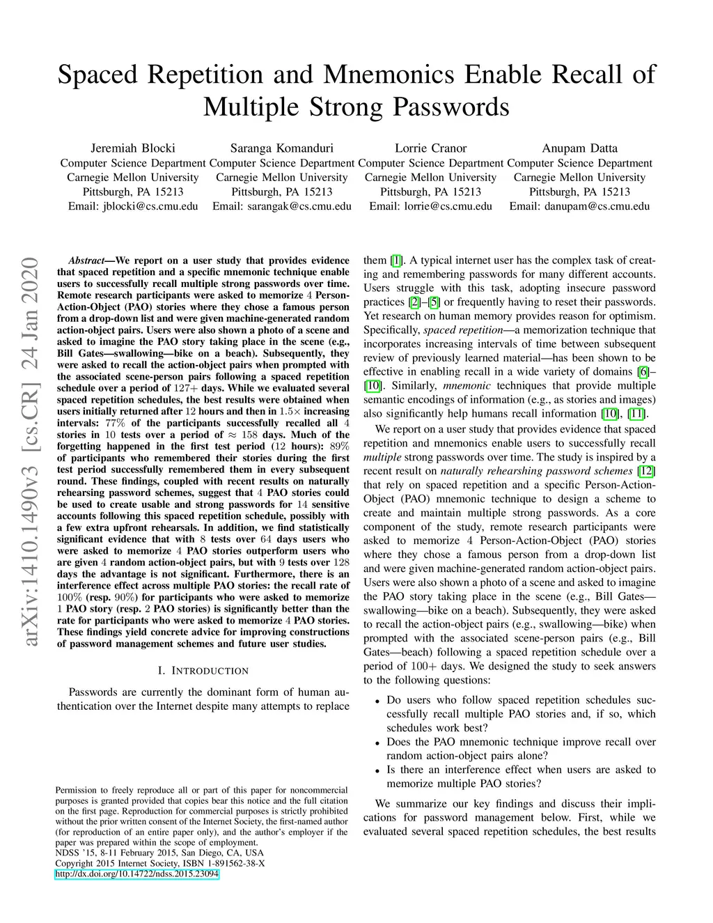 We report on a user study that provides evidence that spaced repetition and a specific mnemonic technique enable users to successfully recall multiple strong passwords over time. Remote research participants were asked to memorize 4 Person-Action-Object (PAO) stories where they chose a famous person from a drop-down list and were given machine-generated random action-object pairs. Users were also shown a photo of a scene and asked to imagine the PAO story taking place in the scene (e.g., Bill Gates---swallowing---bike on a beach). Subsequently, they were asked to recall the action-object pairs when prompted with the associated scene-person pairs following a spaced repetition schedule over a period of 127+ days. While we evaluated several spaced repetition schedules, the best results were obtained when users initially returned after 12 hours and then in increasing intervals: 77% of the participants successfully recalled all 4 stories in 10 tests over a period of 158 days. Much of the forgetting happened in the first test period (12 hours): 89% of participants who remembered their stories during the first test period successfully remembered them in every subsequent round. These findings, coupled with recent results on naturally rehearsing password schemes, suggest that 4 PAO stories could be used to create usable and strong passwords for 14 sensitive accounts following this spaced repetition schedule, possibly with a few extra upfront rehearsals. In addition, we find that there is an interference effect across multiple PAO stories: the recall rate of 100% (resp. 90%) for participants who were asked to memorize 1 PAO story (resp. 2 PAO stories) is significantly better than the recall rate for participants who were asked to memorize 4 PAO stories. These findings yield concrete advice for improving constructions of password management schemes and future user studies.