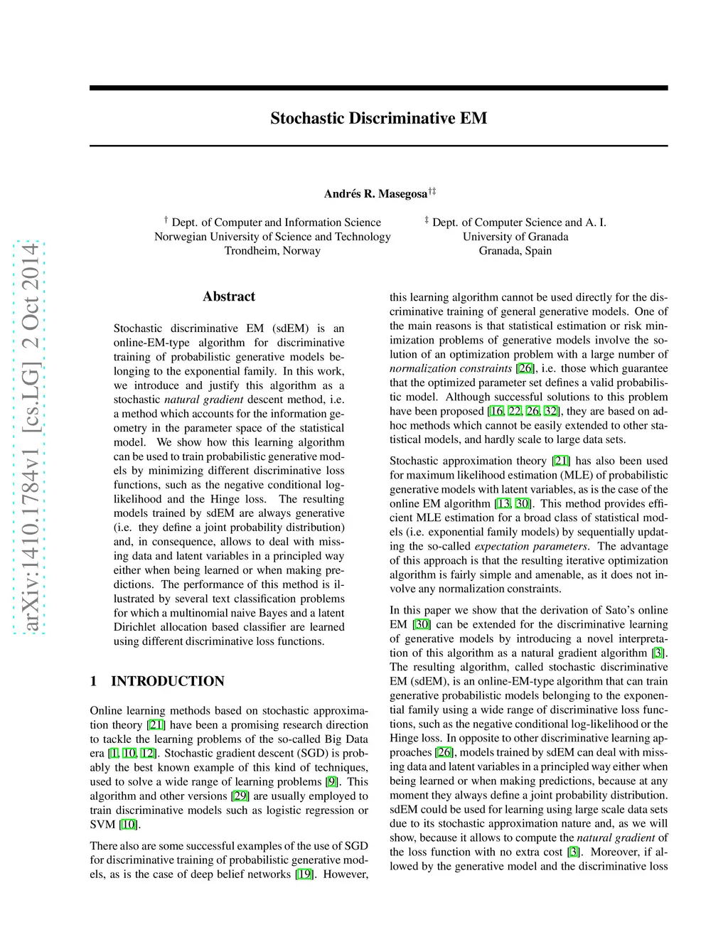 Stochastic discriminative EM (sdEM) is an online-EM-type algorithm for discriminative training of probabilistic generative models belonging to the exponential family. In this work, we introduce and justify this algorithm as a stochastic natural gradient descent method, i.e. a method which accounts for the information geometry in the parameter space of the statistical model. We show how this learning algorithm can be used to train probabilistic generative models by minimizing different discriminative loss functions, such as the negative conditional log-likelihood and the Hinge loss. The resulting models trained by sdEM are always generative (i.e. they define a joint probability distribution) and, in consequence, allows to deal with missing data and latent variables in a principled way either when being learned or when making predictions. The performance of this method is illustrated by several text classification problems for which a multinomial naive Bayes and a latent Dirichlet allocation based classifier are learned using different discriminative loss functions.