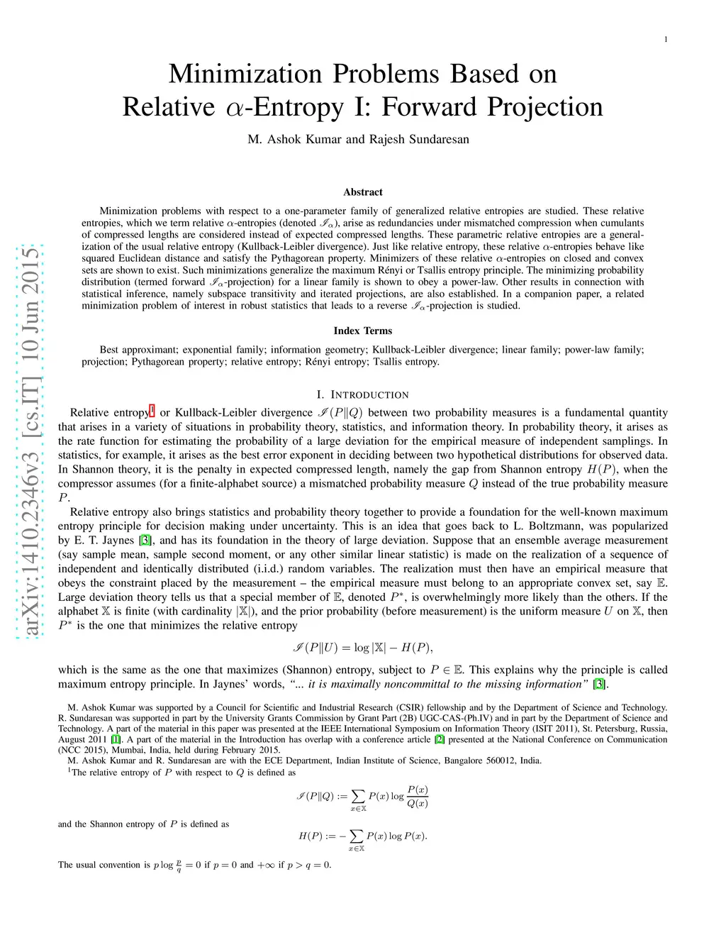 Minimization problems with respect to a one-parameter family of generalized relative entropies are studied. These relative entropies, which we term relative -entropies (denoted ), arise as redundancies under mismatched compression when cumulants of compressed lengths are considered instead of expected compressed lengths. These parametric relative entropies are a generalization of the usual relative entropy (Kullback-Leibler divergence). Just like relative entropy, these relative -entropies behave like squared Euclidean distance and satisfy the Pythagorean property. Minimizers of these relative -entropies on closed and convex sets are shown to exist. Such minimizations generalize the maximum R\'{e}nyi or Tsallis entropy principle. The minimizing probability distribution (termed forward -projection) for a linear family is shown to have a power-law. Other results in connection with statistical inference, namely subspace transitivity and iterated projections, are also established. In a companion paper, a related minimization problem of interest in robust statistics that leads to a reverse -projection is studied.
