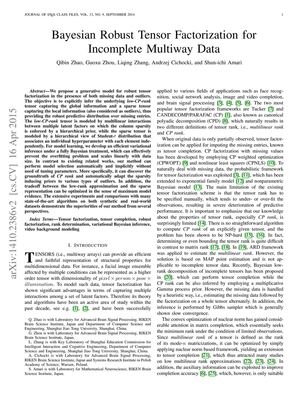 We propose a generative model for robust tensor factorization in the presence of both missing data and outliers. The objective is to explicitly infer the underlying low-CP-rank tensor capturing the global information and a sparse tensor capturing the local information (also considered as outliers), thus providing the robust predictive distribution over missing entries. The low-CP-rank tensor is modeled by multilinear interactions between multiple latent factors on which the column sparsity is enforced by a hierarchical prior, while the sparse tensor is modeled by a hierarchical view of Student- distribution that associates an individual hyperparameter with each element independently. For model learning, we develop an efficient closed-form variational inference under a fully Bayesian treatment, which can effectively prevent the overfitting problem and scales linearly with data size. In contrast to existing related works, our method can perform model selection automatically and implicitly without need of tuning parameters. More specifically, it can discover the groundtruth of CP rank and automatically adapt the sparsity inducing priors to various types of outliers. In addition, the tradeoff between the low-rank approximation and the sparse representation can be optimized in the sense of maximum model evidence. The extensive experiments and comparisons with many state-of-the-art algorithms on both synthetic and real-world datasets demonstrate the superiorities of our method from several perspectives.
