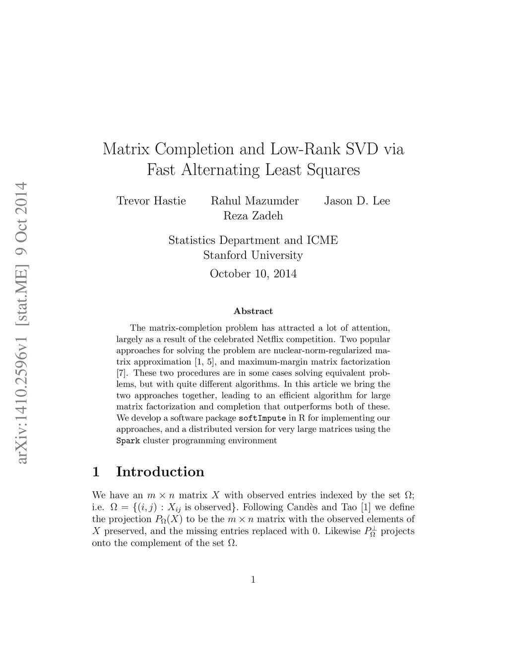 The matrix-completion problem has attracted a lot of attention, largely as a result of the celebrated Netflix competition. Two popular approaches for solving the problem are nuclear-norm-regularized matrix approximation (Candes and Tao, 2009, Mazumder, Hastie and Tibshirani, 2010), and maximum-margin matrix factorization (Srebro, Rennie and Jaakkola, 2005). These two procedures are in some cases solving equivalent problems, but with quite different algorithms. In this article we bring the two approaches together, leading to an efficient algorithm for large matrix factorization and completion that outperforms both of these. We develop a software package "softImpute" in R for implementing our approaches, and a distributed version for very large matrices using the "Spark" cluster programming environment.