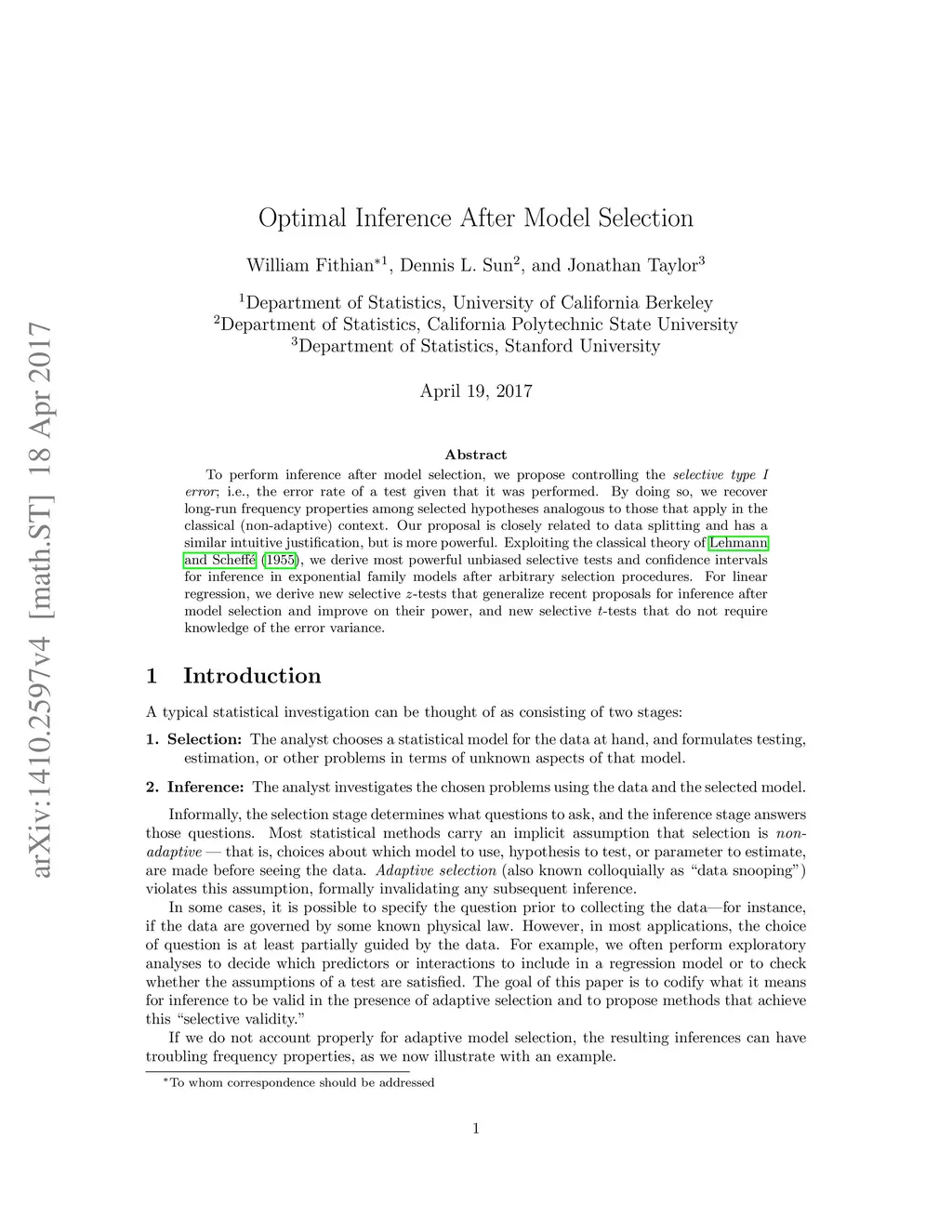 To perform inference after model selection, we propose controlling the selective type I error; i.e., the error rate of a test given that it was performed. By doing so, we recover long-run frequency properties among selected hypotheses analogous to those that apply in the classical (non-adaptive) context. Our proposal is closely related to data splitting and has a similar intuitive justification, but is more powerful. Exploiting the classical theory of Lehmann and Scheff\é (1955), we derive most powerful unbiased selective tests and confidence intervals for inference in exponential family models after arbitrary selection procedures. For linear regression, we derive new selective z-tests that generalize recent proposals for inference after model selection and improve on their power, and new selective t-tests that do not require knowledge of the error variance.