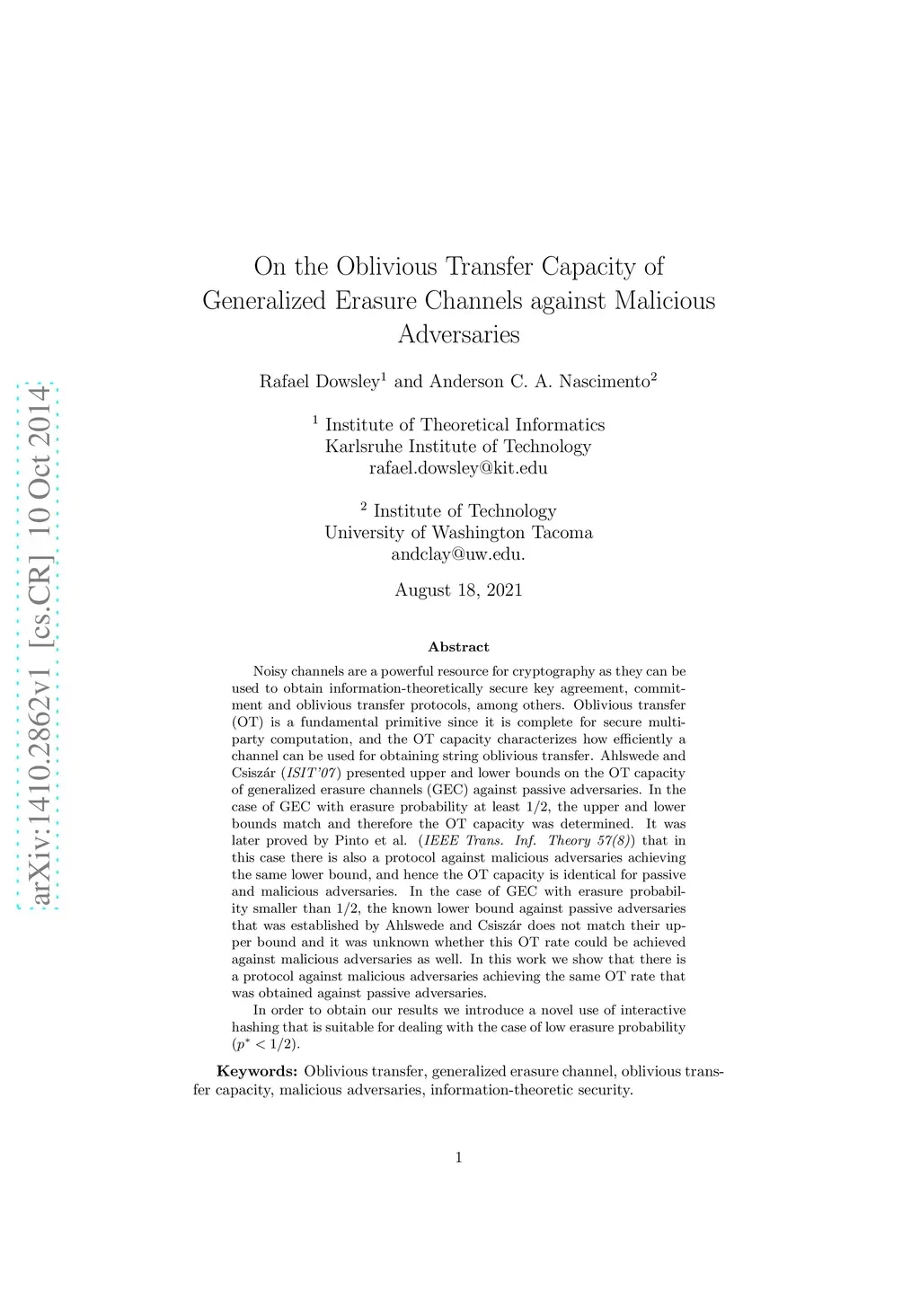Noisy channels are a powerful resource for cryptography as they can be used to obtain information-theoretically secure key agreement, commitment and oblivious transfer protocols, among others. Oblivious transfer (OT) is a fundamental primitive since it is complete for secure multi-party computation, and the OT capacity characterizes how efficiently a channel can be used for obtaining string oblivious transfer. Ahlswede and Csisz\'{a}r (\emph{ISIT'07}) presented upper and lower bounds on the OT capacity of generalized erasure channels (GEC) against passive adversaries. In the case of GEC with erasure probability at least 1/2, the upper and lower bounds match and therefore the OT capacity was determined. It was later proved by Pinto et al. (\emph{IEEE Trans. Inf. Theory 57(8)}) that in this case there is also a protocol against malicious adversaries achieving the same lower bound, and hence the OT capacity is identical for passive and malicious adversaries. In the case of GEC with erasure probability smaller than 1/2, the known lower bound against passive adversaries that was established by Ahlswede and Csisz\'{a}r does not match their upper bound and it was unknown whether this OT rate could be achieved against malicious adversaries as well. In this work we show that there is a protocol against malicious adversaries achieving the same OT rate that was obtained against passive adversaries. In order to obtain our results we introduce a novel use of interactive hashing that is suitable for dealing with the case of low erasure probability ().