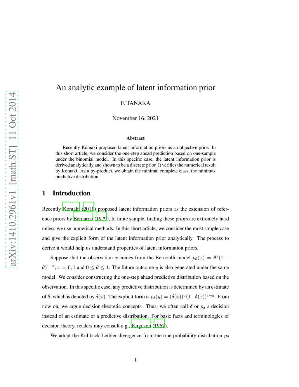 Recently Komaki proposed latent information priors as an objective prior. In this short article, we consider the one-step ahead prediction based on one-sample under the binomial model. In this specific case, the latent information prior is derived analytically and shown to be a discrete prior. It verifies the numerical result by Komaki. As a by-product, we obtain the minimal complete class, the minimax predictive distribution.