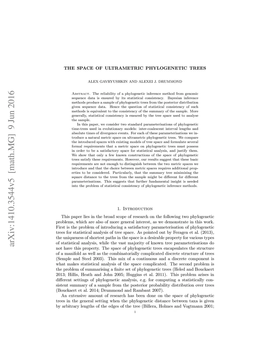 The reliability of a phylogenetic inference method from genomic sequence data is ensured by its statistical consistency. Bayesian inference methods produce a sample of phylogenetic trees from the posterior distribution given sequence data. Hence the question of statistical consistency of such methods is equivalent to the consistency of the summary of the sample. More generally, statistical consistency is ensured by the tree space used to analyse the sample. In this paper, we consider two standard parameterisations of phylogenetic time-trees used in evolutionary models: inter-coalescent interval lengths and absolute times of divergence events. For each of these parameterisations we introduce a natural metric space on ultrametric phylogenetic trees. We compare the introduced spaces with existing models of tree space and formulate several formal requirements that a metric space on phylogenetic trees must possess in order to be a satisfactory space for statistical analysis, and justify them. We show that only a few known constructions of the space of phylogenetic trees satisfy these requirements. However, our results suggest that these basic requirements are not enough to distinguish between the two metric spaces we introduce and that the choice between metric spaces requires additional properties to be considered. Particularly, that the summary tree minimising the square distance to the trees from the sample might be different for different parameterisations. This suggests that further fundamental insight is needed into the problem of statistical consistency of phylogenetic inference methods.