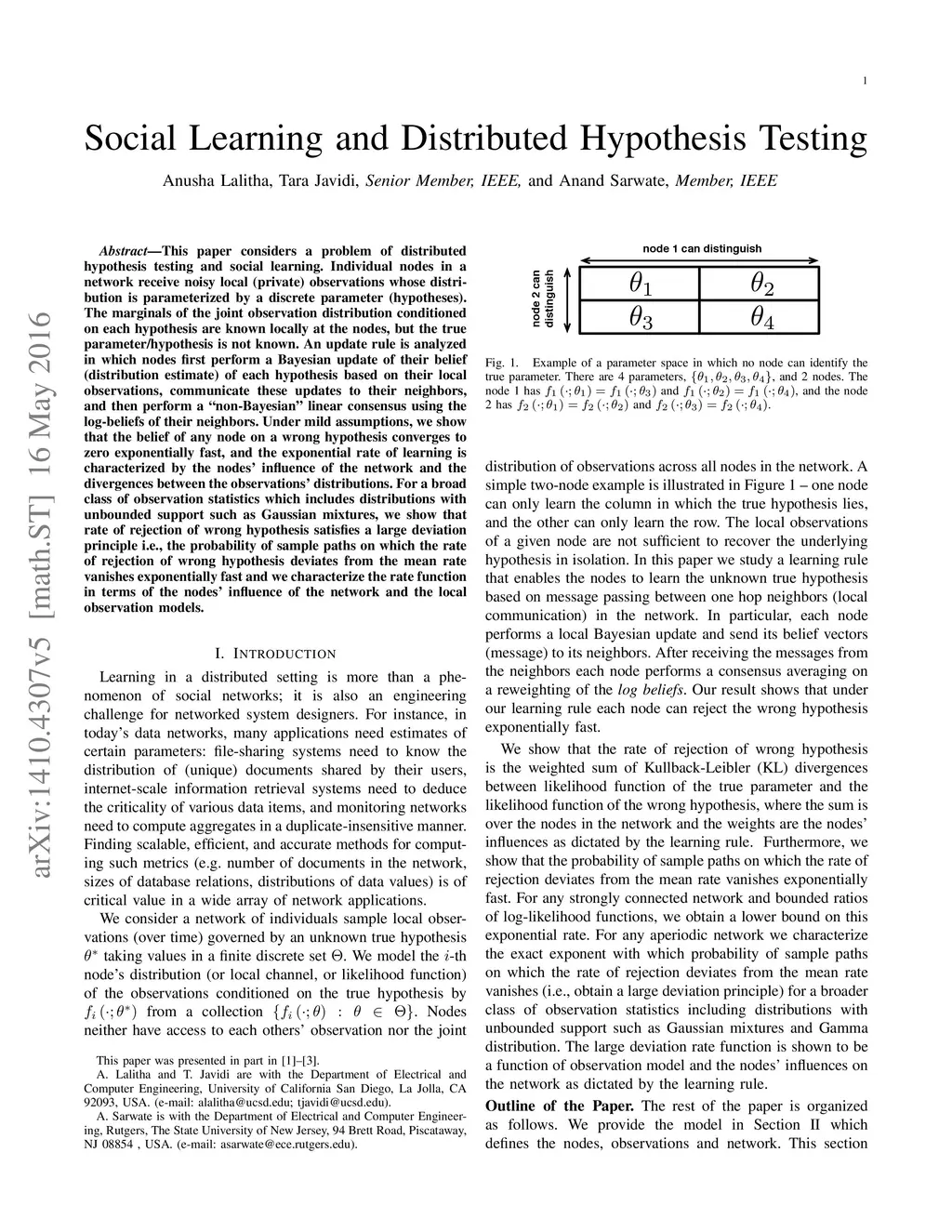 This paper considers a problem of distributed hypothesis testing and social learning. Individual nodes in a network receive noisy local (private) observations whose distribution is parameterized by a discrete parameter (hypotheses). The conditional distributions are known locally at the nodes, but the true parameter/hypothesis is not known. An update rule is analyzed in which nodes first perform a Bayesian update of their belief (distribution estimate) of the parameter based on their local observation, communicate these updates to their neighbors, and then perform a "non-Bayesian" linear consensus using the log-beliefs of their neighbors. In this paper we show that under mild assumptions, the belief of any node in any incorrect hypothesis converges to zero exponentially fast, and we characterize the exponential rate of learning which is given in terms of the network structure and the divergences between the observations' distributions. Our main result is the concentration property established on the rate of convergence.