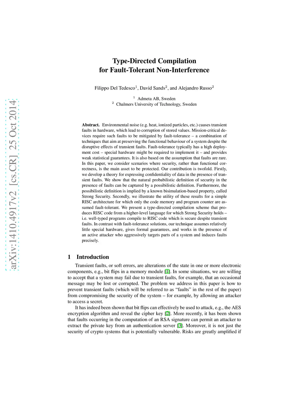 Environmental noise (e.g.heat, ionized particles, etc.) causes transient faults in hardware, which lead to corruption of stored values. Mission-critical devices require such faults to be mitigated by fault-tolerance --- a combination of techniques that aim at preserving the functional behaviour of a system despite the disruptive effects of transient faults. Fault-tolerance typically has a high deployment cost -- special hardware might be required to implement it -- and provides weak statistical guarantees. It is also based on the assumption that faults are rare. In this paper, we consider scenarios where security, rather than functional correctness, is the main asset to be protected. Our contribution is twofold. Firstly, we develop a theory for expressing confidentiality of data in the presence of transient faults. We show that the natural probabilistic definition of security in the presence of faults can be captured by a possibilistic definition. Furthermore, the possibilistic definition is implied by a known bisimulation-based property, called Strong Security. Secondly, we illustrate the utility of these results for a simple RISC architecture for which only the code memory and program counter are assumed fault-tolerant. We present a type-directed compilation scheme that produces RISC code from a higher-level language for which Strong Security holds --- i.e. well-typed programs compile to RISC code which is secure despite transient faults. In contrast with fault-tolerance solutions, our technique assumes relatively little special hardware, gives formal guarantees, and works in the presence of an active attacker who aggressively targets parts of a system and induces faults precisely.