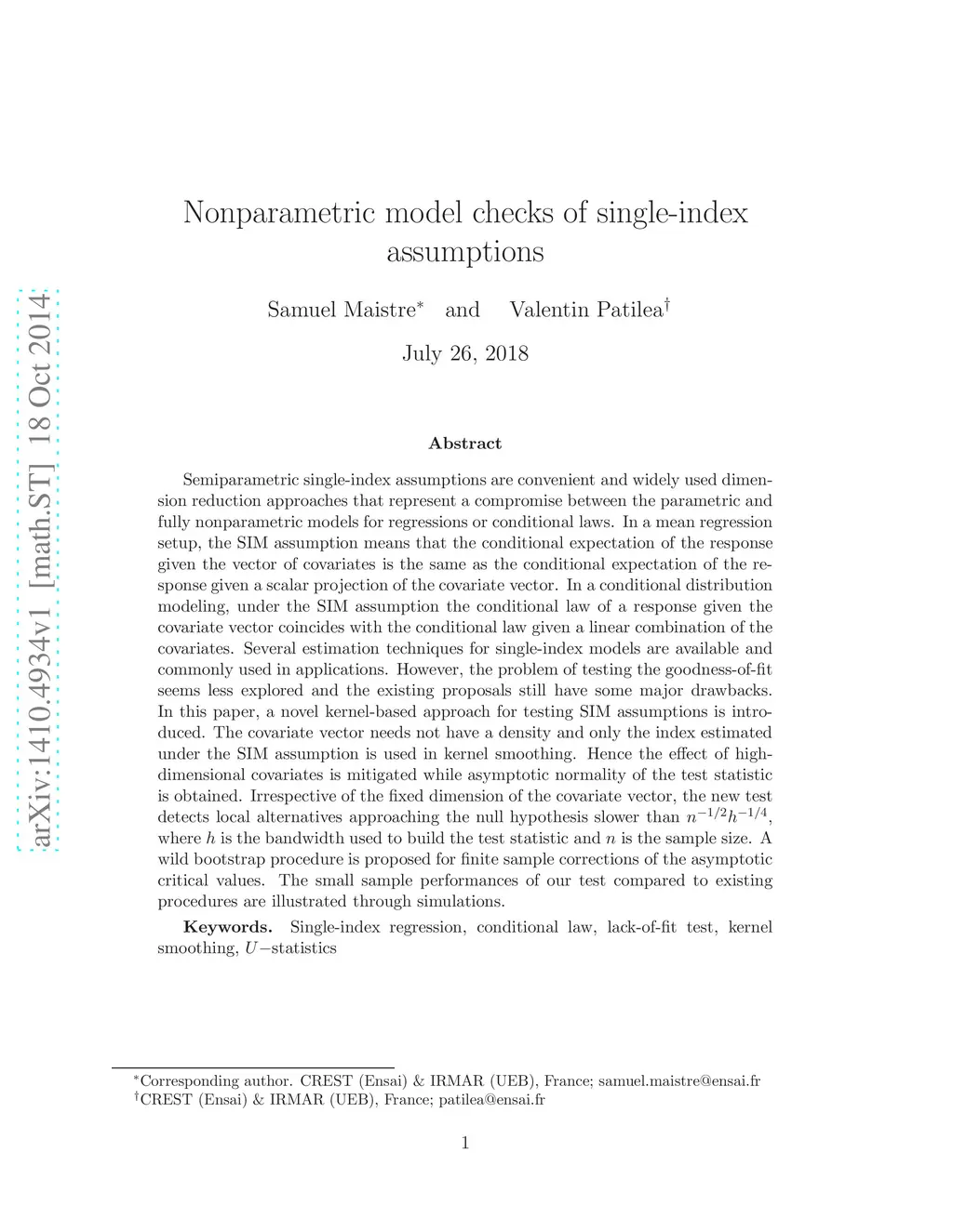 Semiparametric single-index assumptions are convenient and widely used dimen\-sion reduction approaches that represent a compromise between the parametric and fully nonparametric models for regressions or conditional laws. In a mean regression setup, the SIM assumption means that the conditional expectation of the response given the vector of covariates is the same as the conditional expectation of the response given a scalar projection of the covariate vector. In a conditional distribution modeling, under the SIM assumption the conditional law of a response given the covariate vector coincides with the conditional law given a linear combination of the covariates. Several estimation techniques for single-index models are available and commonly used in applications. However, the problem of testing the goodness-of-fit seems less explored and the existing proposals still have some major drawbacks. In this paper, a novel kernel-based approach for testing SIM assumptions is introduced. The covariate vector needs not have a density and only the index estimated under the SIM assumption is used in kernel smoothing. Hence the effect of high-dimensional covariates is mitigated while asymptotic normality of the test statistic is obtained. Irrespective of the fixed dimension of the covariate vector, the new test detects local alternatives approaching the null hypothesis slower than where is the bandwidth used to build the test statistic and is the sample size. A wild bootstrap procedure is proposed for finite sample corrections of the asymptotic critical values. The small sample performances of our test compared to existing procedures are illustrated through simulations.