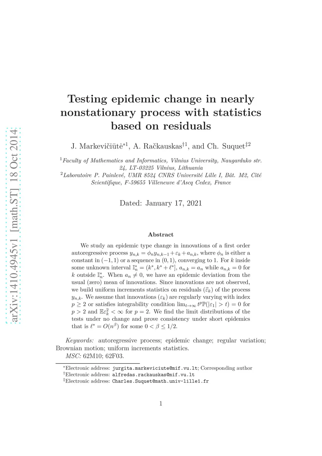 We study an epidemic type change in innovations of a first order autoregressive process $ y_{n,k} = \varphi_n y_{n,k-1} + \epsilon_{k} + a_{n,k}$, where is either a constant in or a sequence in , converging to 1. For inside some unknown interval , while for outside . When , we have an epidemic deviation from the usual (zero) mean of innovations. Since innovations are not observed, we build uniform increments statistics on residuals of the process . We assume that innovations are regularly varying with index or satisfies integrability condition for and for . We find the limit distributions of the tests under no change and prove consistency under short epidemics that is for some .