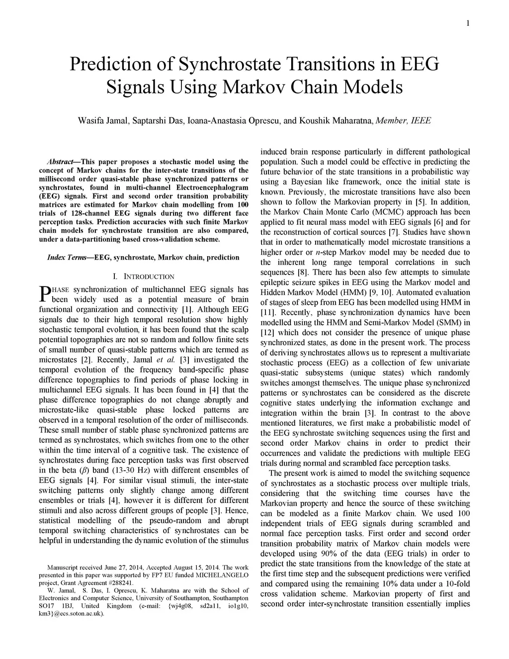 This paper proposes a stochastic model using the concept of Markov chains for the inter-state transitions of the millisecond order quasi-stable phase synchronized patterns or synchrostates, found in multi-channel Electroencephalogram (EEG) signals. First and second order transition probability matrices are estimated for Markov chain modelling from 100 trials of 128-channel EEG signals during two different face perception tasks. Prediction accuracies with such finite Markov chain models for synchrostate transition are also compared, under a data-partitioning based cross-validation scheme.