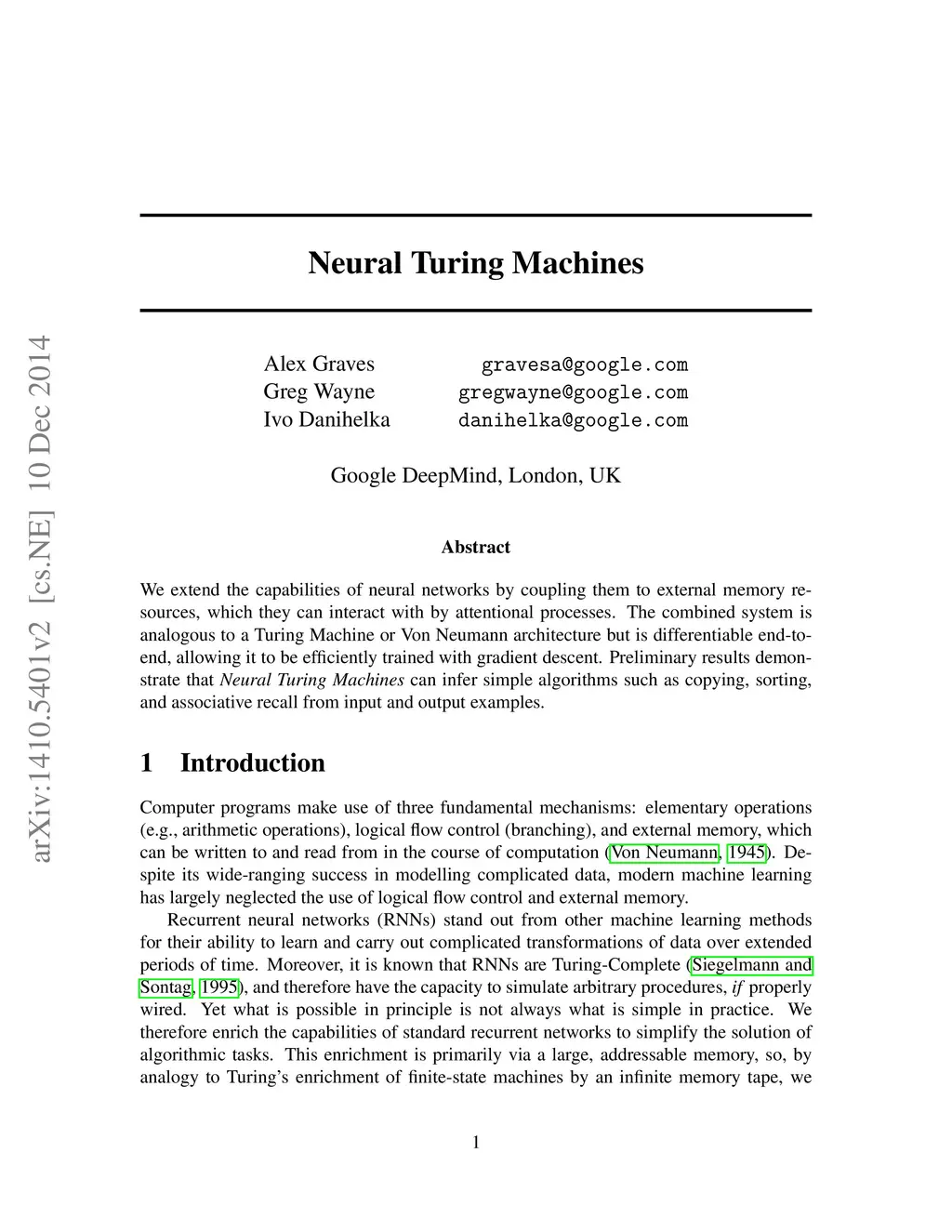 We extend the capabilities of neural networks by coupling them to external memory resources, which they can interact with by attentional processes. The combined system is analogous to a Turing Machine or Von Neumann architecture but is differentiable end-to-end, allowing it to be efficiently trained with gradient descent. Preliminary results demonstrate that Neural Turing Machines can infer simple algorithms such as copying, sorting, and associative recall from input and output examples.