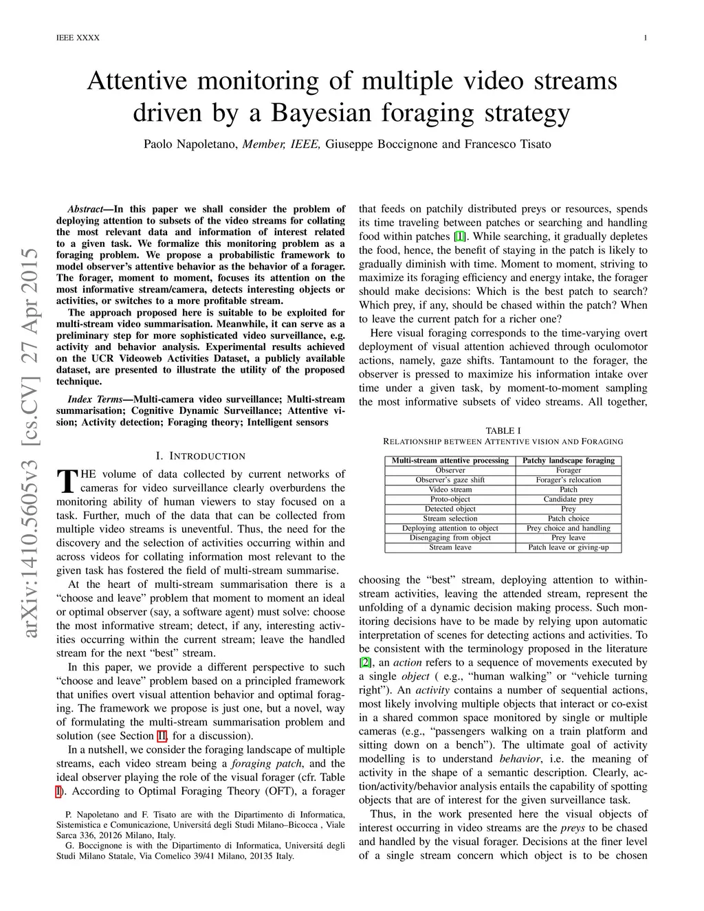 In this paper we shall consider the problem of deploying attention to subsets of the video streams for collating the most relevant data and information of interest related to a given task. We formalize this monitoring problem as a foraging problem. We propose a probabilistic framework to model observer's attentive behavior as the behavior of a forager. The forager, moment to moment, focuses its attention on the most informative stream/camera, detects interesting objects or activities, or switches to a more profitable stream. The approach proposed here is suitable to be exploited for multi-stream video summarization. Meanwhile, it can serve as a preliminary step for more sophisticated video surveillance, e.g. activity and behavior analysis. Experimental results achieved on the UCR Videoweb Activities Dataset, a publicly available dataset, are presented to illustrate the utility of the proposed technique.