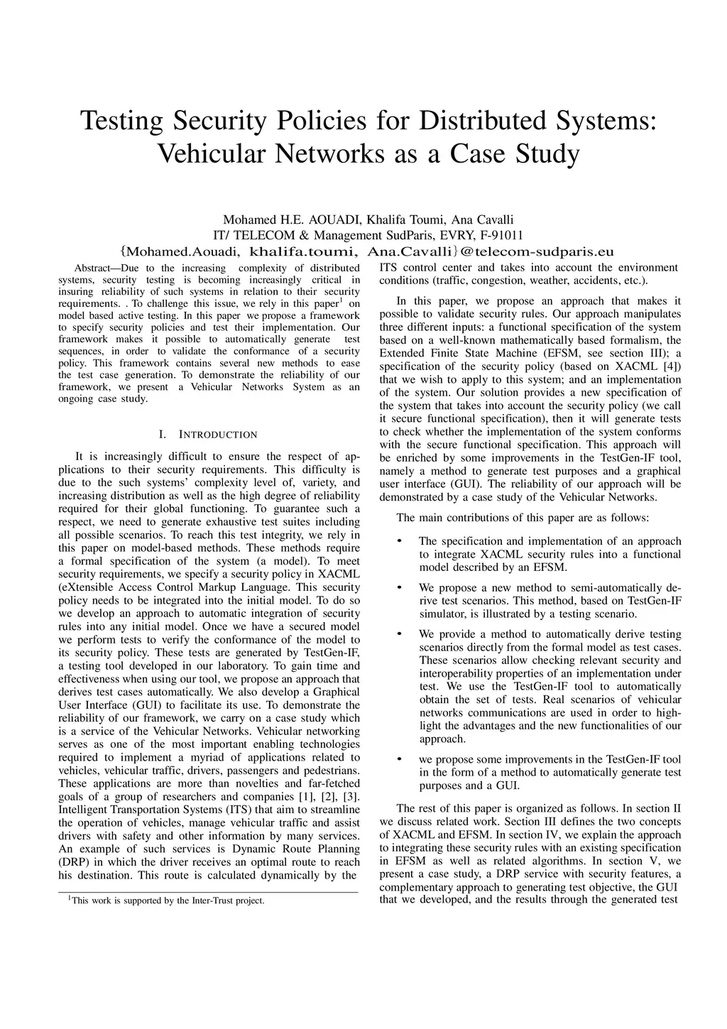 Due to the increasing complexity of distributed systems, security testing is becoming increasingly critical in insuring reliability of such systems in relation to their security requirements. . To challenge this issue, we rely in this paper1 on model based active testing. In this paper we propose a framework to specify security policies and test their implementation. Our framework makes it possible to automatically generate test sequences, in order to validate the conformance of a security policy. This framework contains several new methods to ease the test case generation. To demonstrate the reliability of our framework, we present a Vehicular Networks System as an ongoing case study.