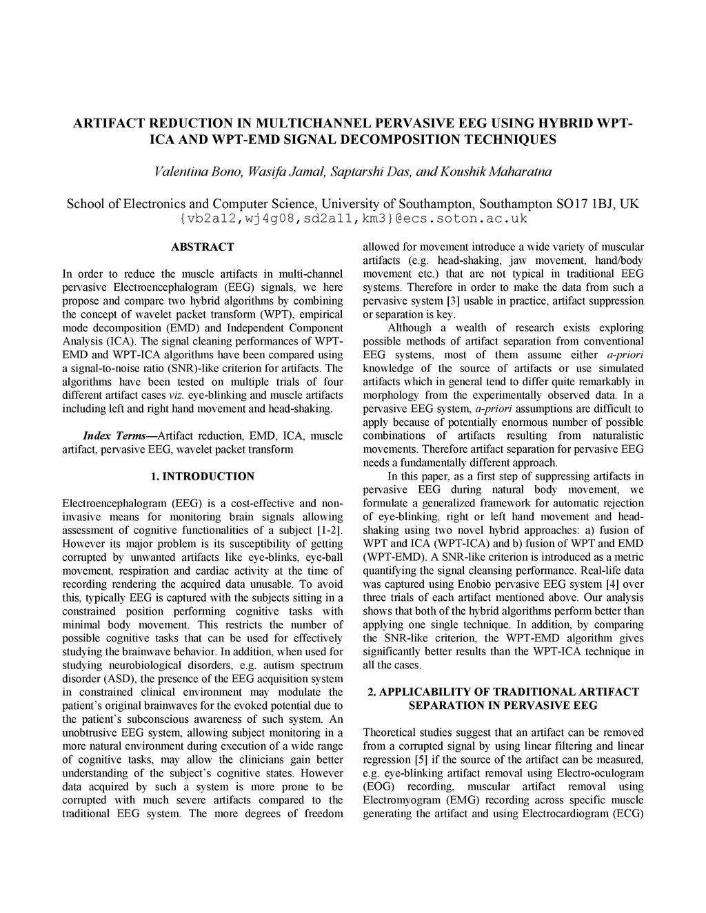 Artifact reduction in multichannel pervasive EEG using hybrid WPT-ICA