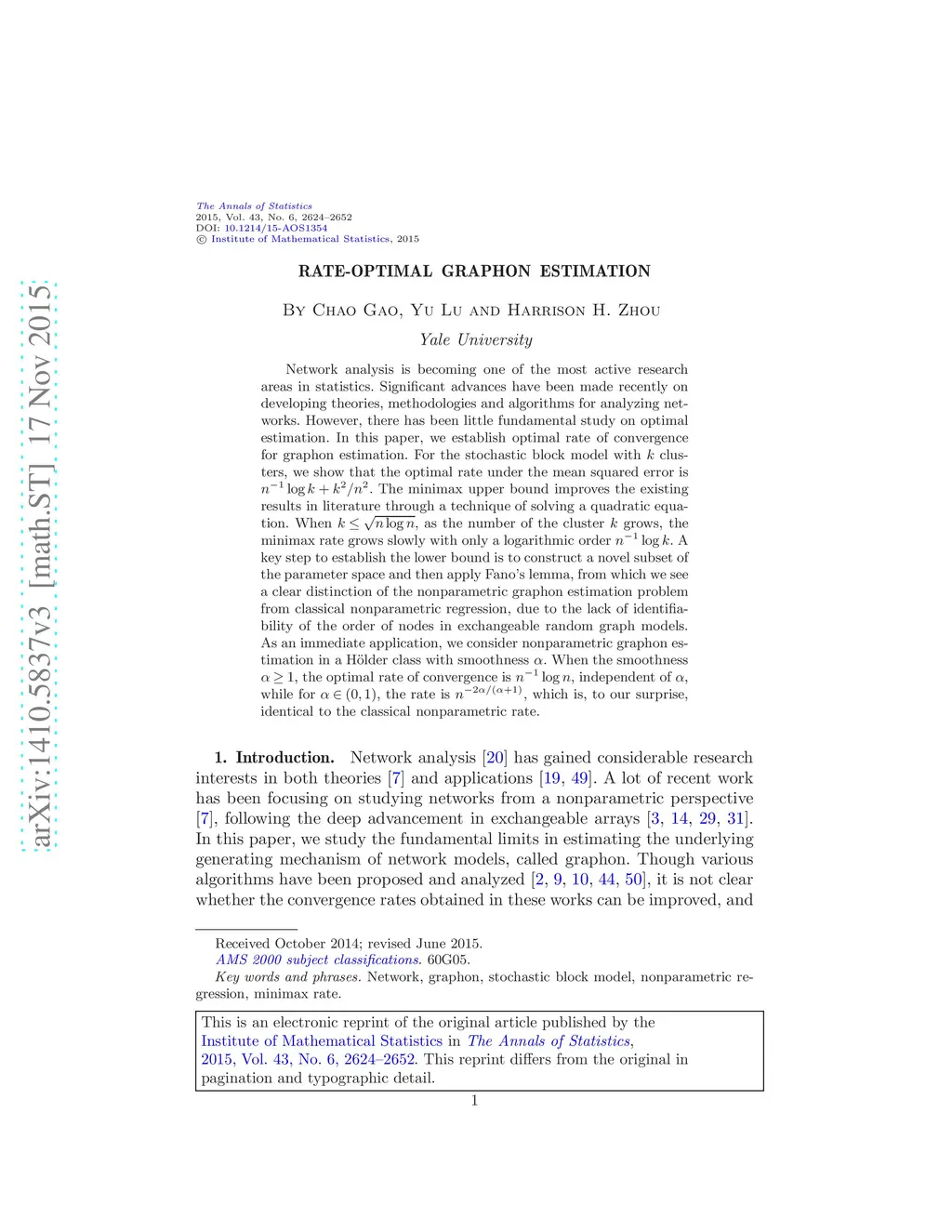 Network analysis is becoming one of the most active research areas in statistics. Significant advances have been made recently on developing theories, methodologies and algorithms for analyzing networks. However, there has been little fundamental study on optimal estimation. In this paper, we establish optimal rate of convergence for graphon estimation. For the stochastic block model with clusters, we show that the optimal rate under the mean squared error is . The minimax upper bound improves the existing results in literature through a technique of solving a quadratic equation. When , as the number of the cluster grows, the minimax rate grows slowly with only a logarithmic order . A key step to establish the lower bound is to construct a novel subset of the parameter space and then apply Fano's lemma, from which we see a clear distinction of the nonparametric graphon estimation problem from classical nonparametric regression, due to the lack of identifiability of the order of nodes in exchangeable random graph models. As an immediate application, we consider nonparametric graphon estimation in a H\"{o}lder class with smoothness . When the smoothness , the optimal rate of convergence is , independent of , while for , the rate is , which is, to our surprise, identical to the classical nonparametric rate.