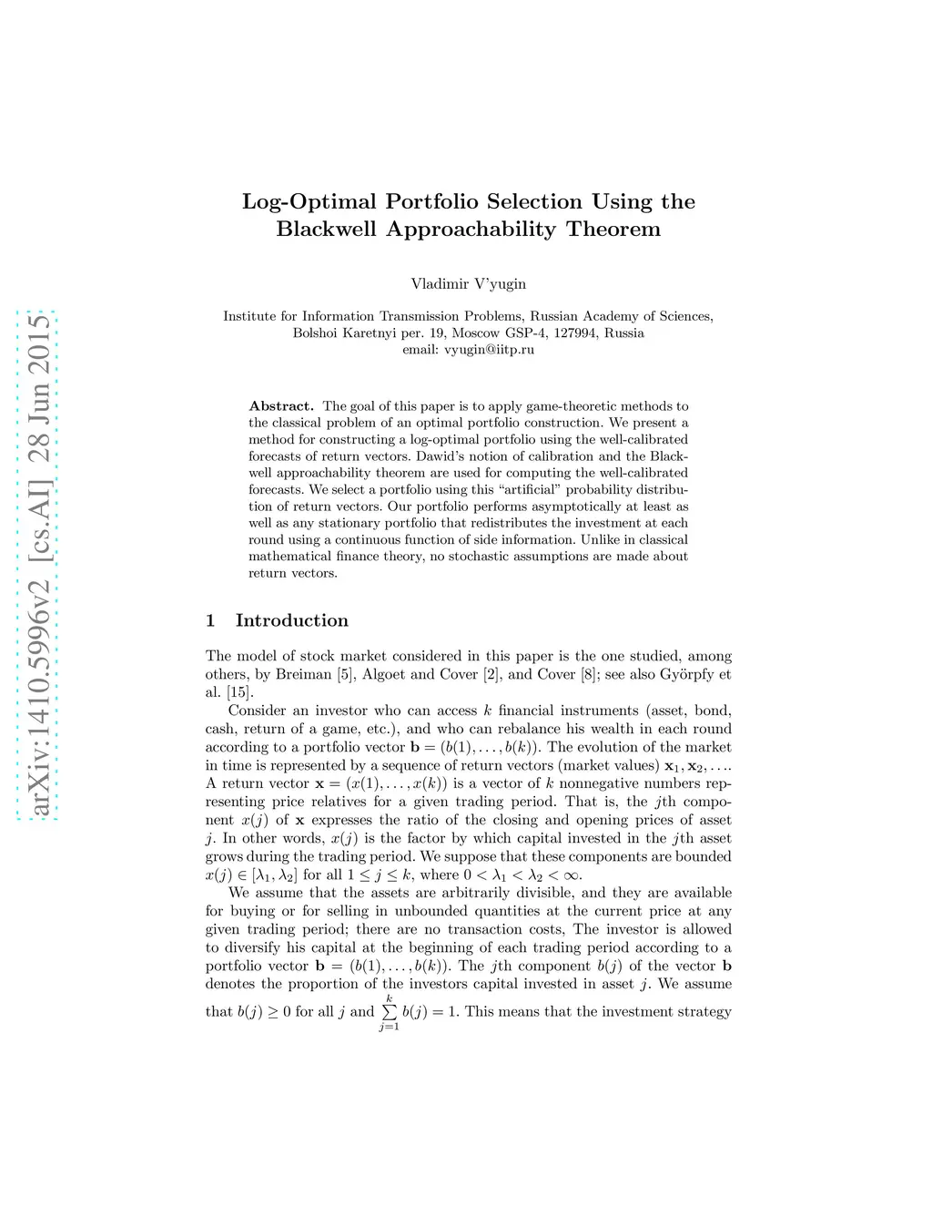 Log-Optimal Portfolio Selection Using the Blackwell Approachability