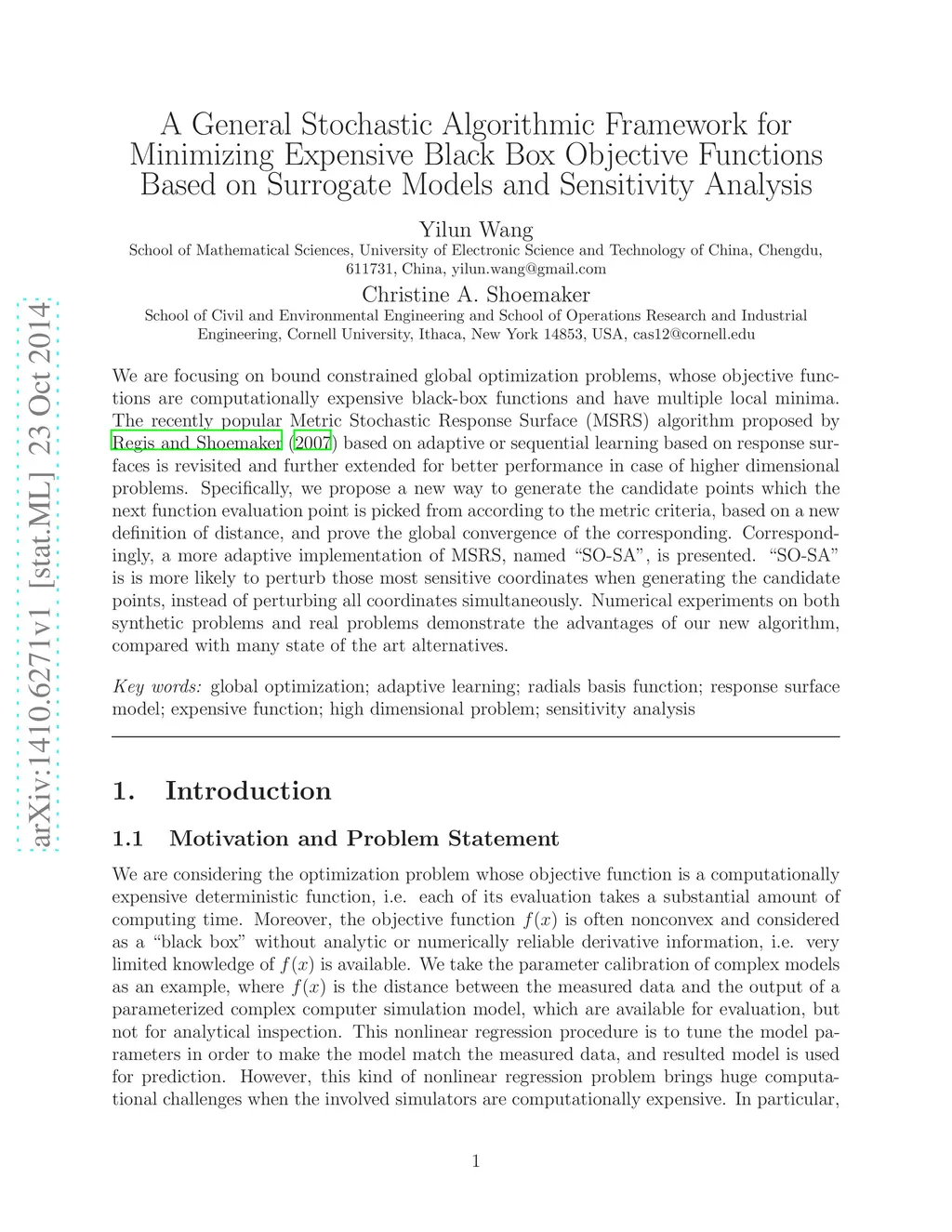 We are focusing on bound constrained global optimization problems, whose objective functions are computationally expensive black-box functions and have multiple local minima. The recently popular Metric Stochastic Response Surface (MSRS) algorithm proposed by \cite{Regis2007SRBF} based on adaptive or sequential learning based on response surfaces is revisited and further extended for better performance in case of higher dimensional problems. Specifically, we propose a new way to generate the candidate points which the next function evaluation point is picked from according to the metric criteria, based on a new definition of distance, and prove the global convergence of the corresponding. Correspondingly, a more adaptive implementation of MSRS, named "SO-SA", is presented. "SO-SA" is is more likely to perturb those most sensitive coordinates when generating the candidate points, instead of perturbing all coordinates simultaneously. Numerical experiments on both synthetic problems and real problems demonstrate the advantages of our new algorithm, compared with many state of the art alternatives.}
