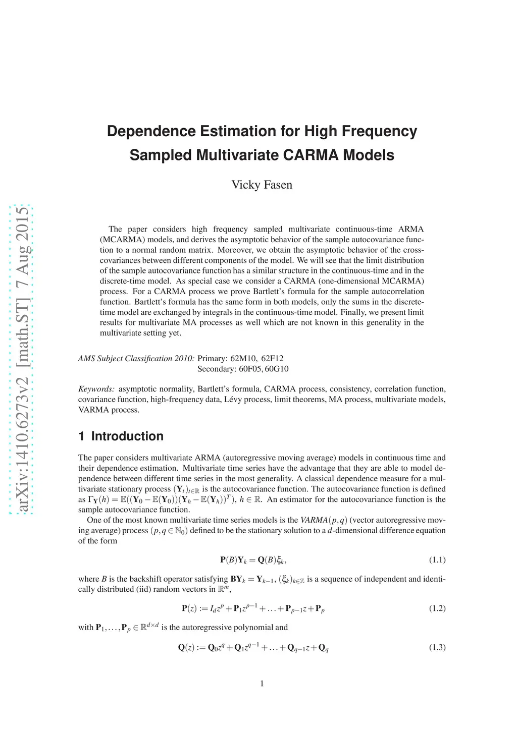 The paper considers high frequency sampled multivariate continuous-time ARMA (MCARMA) models, and derives the asymptotic behavior of the sample autocovariance function to a normal random matrix. Moreover, we obtain the asymptotic behavior of the cross-covariances between different components of the model. We will see that the limit distribution of the sample autocovariance function has a similar structure in the continuous-time and in the discrete-time model. As special case we consider a CARMA (one-dimensional MCARMA) process. For a CARMA process we prove Bartlett's formula for the sample autocorrelation function. Bartlett's formula has the same form in both models, only the sums in the discrete-time model are exchanged by integrals in the continuous-time model. Finally, we present limit results for multivariate MA processes as well which are not known in this generality in the multivariate setting yet.