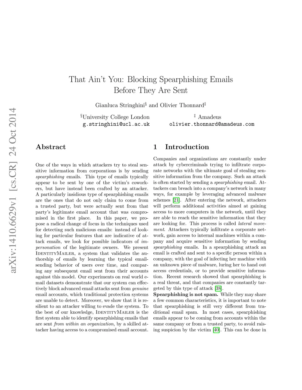 One of the ways in which attackers try to steal sensitive information from corporations is by sending spearphishing emails. This type of emails typically appear to be sent by one of the victim's coworkers, but have instead been crafted by an attacker. A particularly insidious type of spearphishing emails are the ones that do not only claim to come from a trusted party, but were actually sent from that party's legitimate email account that was compromised in the first place. In this paper, we propose a radical change of focus in the techniques used for detecting such malicious emails: instead of looking for particular features that are indicative of attack emails, we look for possible indicators of impersonation of the legitimate owners. We present IdentityMailer, a system that validates the authorship of emails by learning the typical email-sending behavior of users over time, and comparing any subsequent email sent from their accounts against this model. Our experiments on real world e-mail datasets demonstrate that our system can effectively block advanced email attacks sent from genuine email accounts, which traditional protection systems are unable to detect. Moreover, we show that it is resilient to an attacker willing to evade the system. To the best of our knowledge, IdentityMailer is the first system able to identify spearphishing emails that are sent from within an organization, by a skilled attacker having access to a compromised email account.