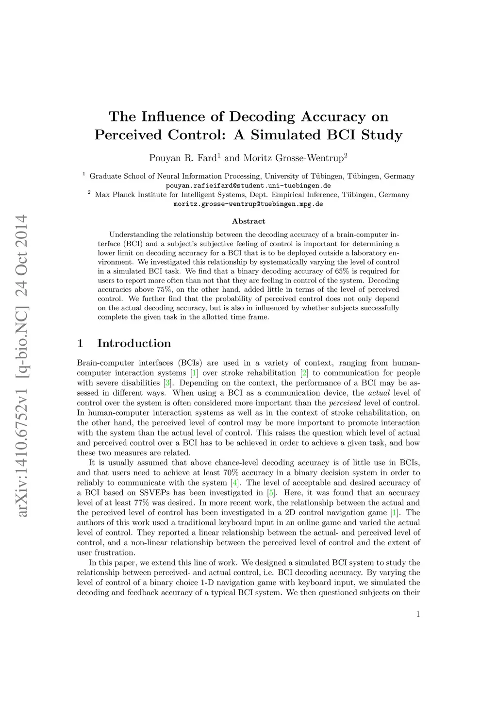 The Influence of Decoding Accuracy on Perceived Control: A Simulated BCI