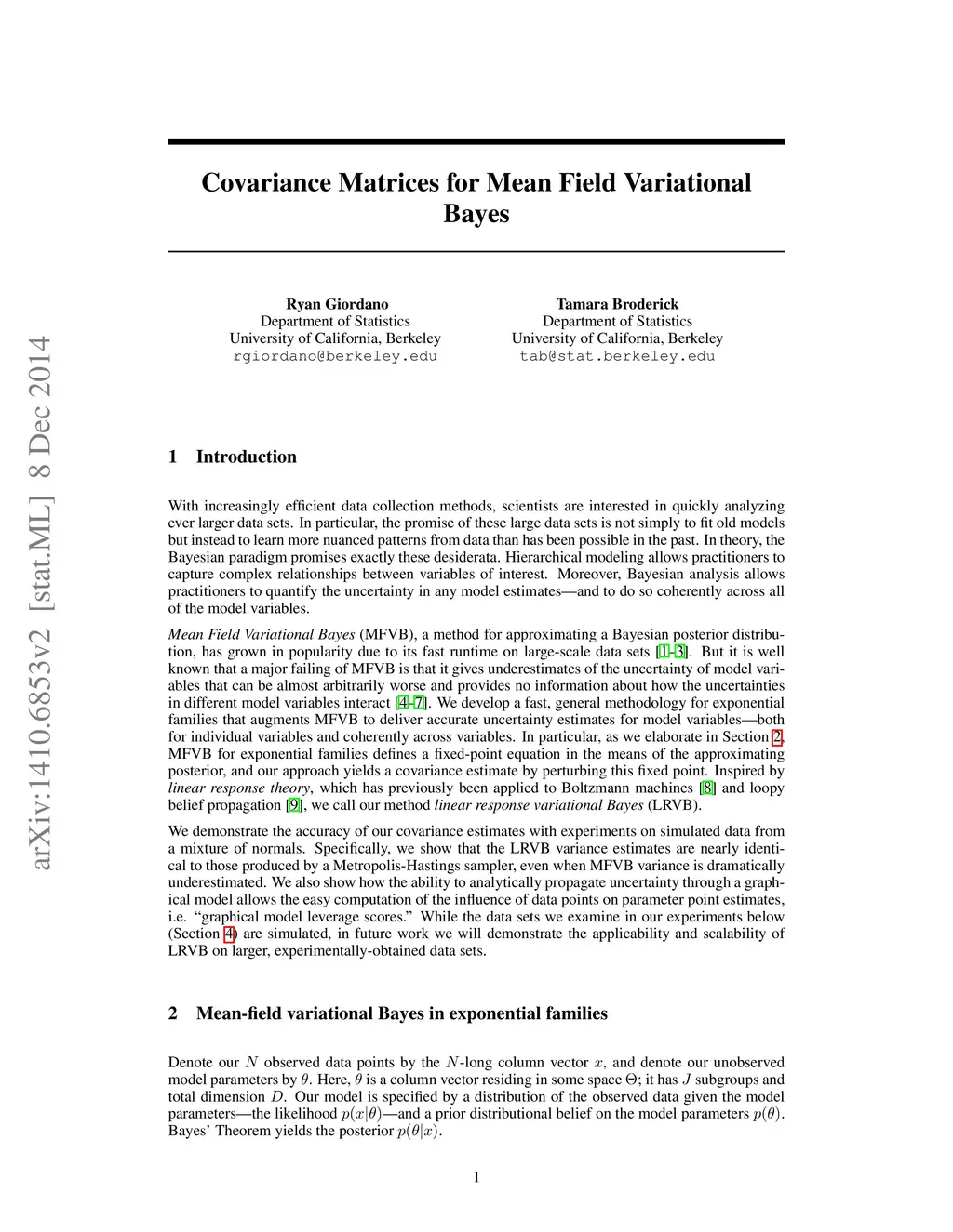 Mean Field Variational Bayes (MFVB) is a popular posterior approximation method due to its fast runtime on large-scale data sets. However, it is well known that a major failing of MFVB is its (sometimes severe) underestimates of the uncertainty of model variables and lack of information about model variable covariance. We develop a fast, general methodology for exponential families that augments MFVB to deliver accurate uncertainty estimates for model variables -- both for individual variables and coherently across variables. MFVB for exponential families defines a fixed-point equation in the means of the approximating posterior, and our approach yields a covariance estimate by perturbing this fixed point. Inspired by linear response theory, we call our method linear response variational Bayes (LRVB). We demonstrate the accuracy of our method on simulated data sets.