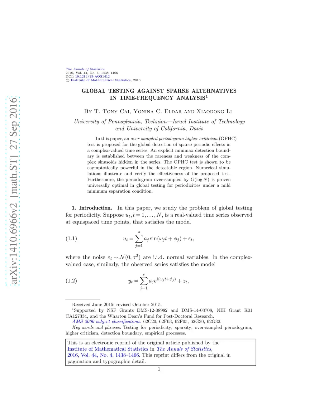 In this paper, an over-sampled periodogram higher criticism (OPHC) test is proposed for the global detection of sparse periodic effects in a complex-valued time series. An explicit minimax detection boundary is established between the rareness and weakness of the complex sinusoids hidden in the series. The OPHC test is shown to be asymptotically powerful in the detectable region. Numerical simulations illustrate and verify the effectiveness of the proposed test. Furthermore, the periodogram over-sampled by is proven universally optimal in global testing for periodicities under a mild minimum separation condition.