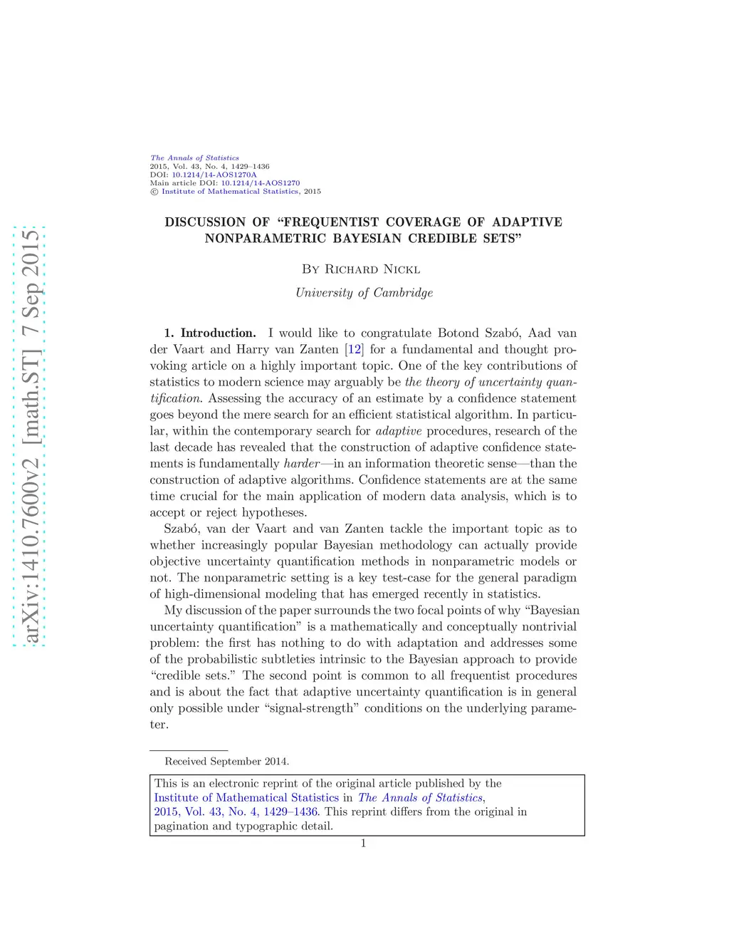 Discussion of "Frequentist coverage of adaptive nonparametric Bayesian credible sets" by Szab\ó, van der Vaart and van Zanten [arXiv:1310.4489v5].