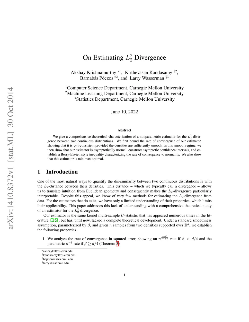 We give a comprehensive theoretical characterization of a nonparametric estimator for the divergence between two continuous distributions. We first bound the rate of convergence of our estimator, showing that it is -consistent provided the densities are sufficiently smooth. In this smooth regime, we then show that our estimator is asymptotically normal, construct asymptotic confidence intervals, and establish a Berry-Ess\'{e}en style inequality characterizing the rate of convergence to normality. We also show that this estimator is minimax optimal.